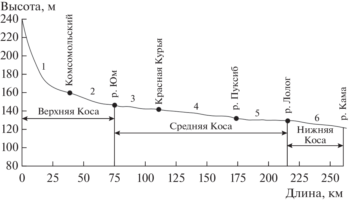 Статья посвящена выявлению особенностей развития русловых процессов в речных долинах с распространением озерно-ледниковых террас. В качестве примера выбрана р. Коса – крупнейший правобережный приток верхнего течения Камы. Для дешифрирования космических снимков и получения количественной информации использовались ресурсы GoogleEarthPro и Яндекс Карты. На основе анализа элементов пойменно-русловых комплексов проведена морфодинамическая типизация русла. В качестве особенностей развития русловых процессов на участках распространения озерно-ледниковой террасы рассматривался показатель соотношения ширины поймы к ширине долины. В верхнем течении Косы (за пределами Косинской низменности) это соотношение составляет 1 : 1, в среднем – 1 : 9, в нижнем – 1 : 3. К особенностям развития русловых процессов относится расположение пояса меандрирования строго в левой прибортовой части долины, что указывает на наличие в прошлом устойчивого и продолжительного по времени смещения русла с востока на запад. Для верхнего течения реки ведущими морфодинамическими типами русла являются свободные сегментные излучины и адаптированное прямолинейное русло. В среднем течении Косы, в котором большая часть долины представлена озерно-ледниковой террасой, при сохранении ведущей роли сегментных излучин значимую роль в структуре морфодинамических типов русел уже играют вынужденные излучины. При этом наблюдается высокая доля распространения адаптированного прямолинейного русла.