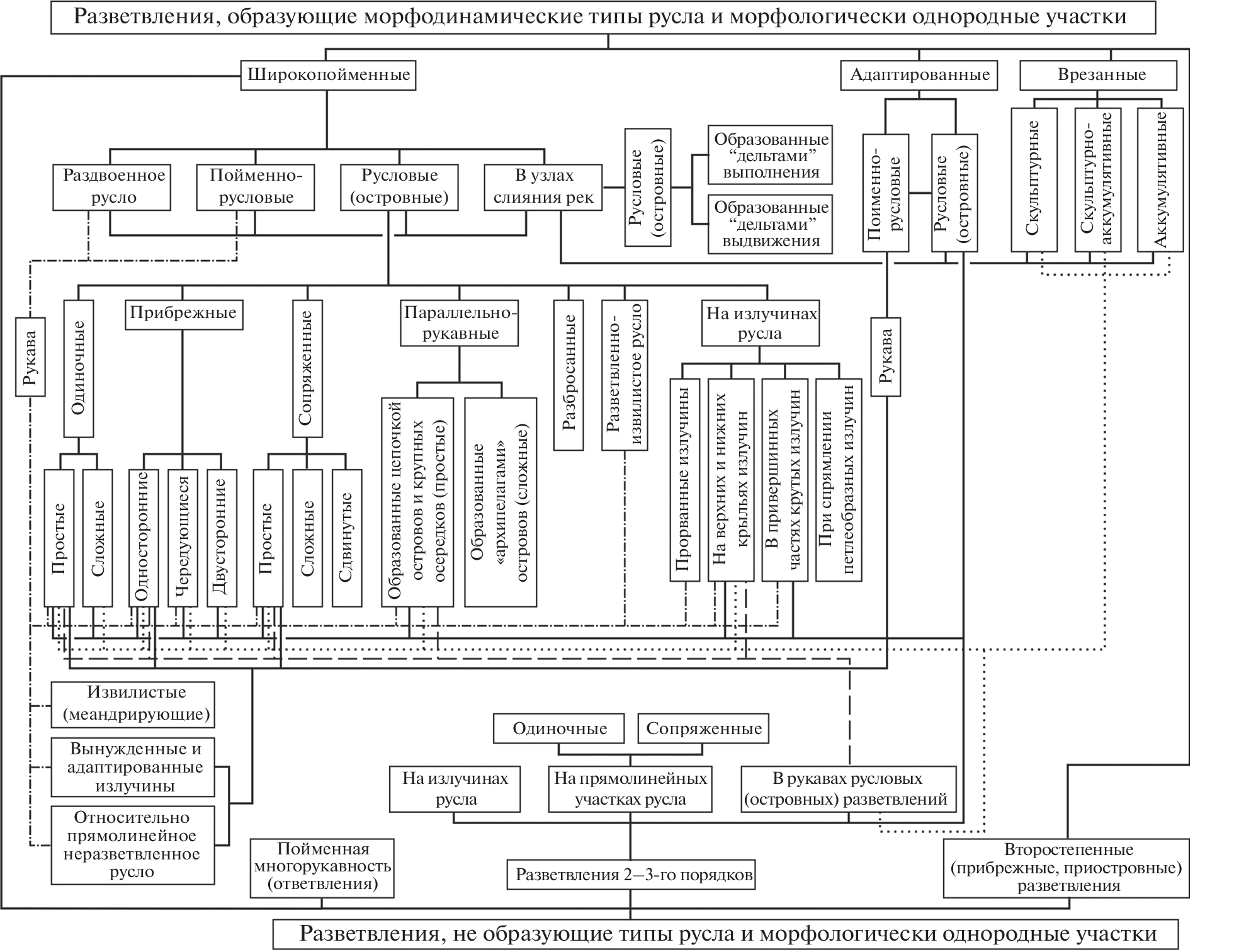 Based on many years of research, a justification is given for a complete classification of branches that form morphologically homogeneous areas in different geological and geomorphological conditions, which are formed in branches of branches of different structural levels and in channels of other morphodynamic types. An analysis of the conditions for the formation of river channel branches, their morphology, deformations and reformations showed that the classification must take into account the structural levels of branches and their morphodynamic types; separately highlight the diversity of branches in a winding channel, forming a separate type of channel or morphologically homogeneous areas; take into account single branches at bends, in a straight channel and in the branches of branches; highlight floodplain multi-branching, secondary coastal or near-island branches, as well as branching of the second and third orders. The arms of channel (island) branches can be gentle bends, the spurs of which are islands; straight channel; branching of the second and third orders, the combination of which creates different types of branching in the arms. The development of a classification of branchings, as well as the morphodynamic classification of river channels of the Moscow State University in general, makes it possible to refine it as the branching of river channels is studied, to create new levels (blocks) in it, allowing to take into account the increasing morphological and dynamic diversity of branches and the conditions of their formation.