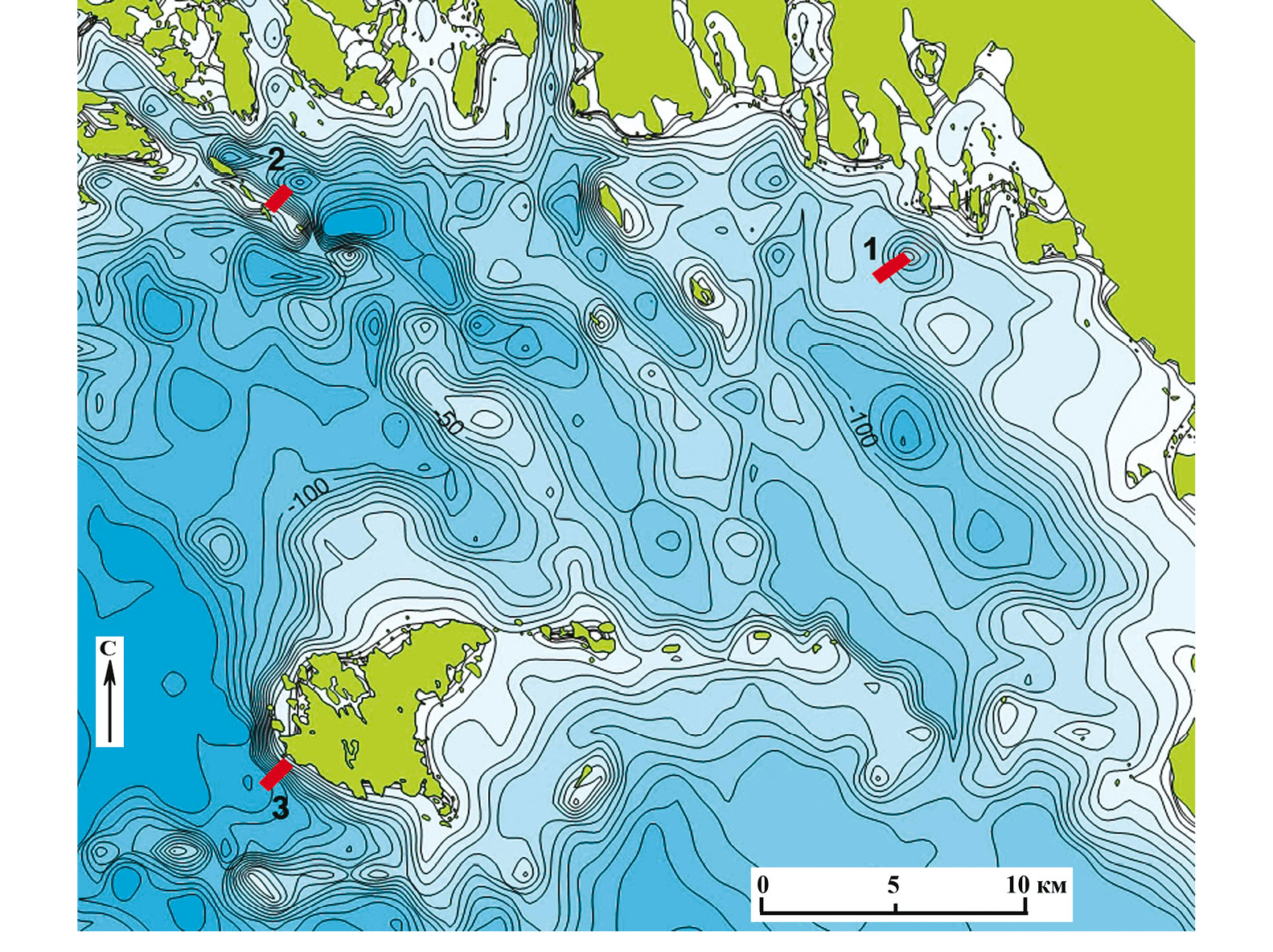 Рис. 3. Положение профилей донной фотовидеосъемки, обнаруживших субвертикальные уступы, на батиметрической схеме северной части Ладожского озера (батиметрия построена на основе цифровой модели рельефа С.Н. Юдина и Д.С. Дудаковой [16], изобаты через 10 м). 1 – профиль в районе Питкяранта, 2 – профиль в районе Мустасаари, 3 – профиль в районе Валаам.