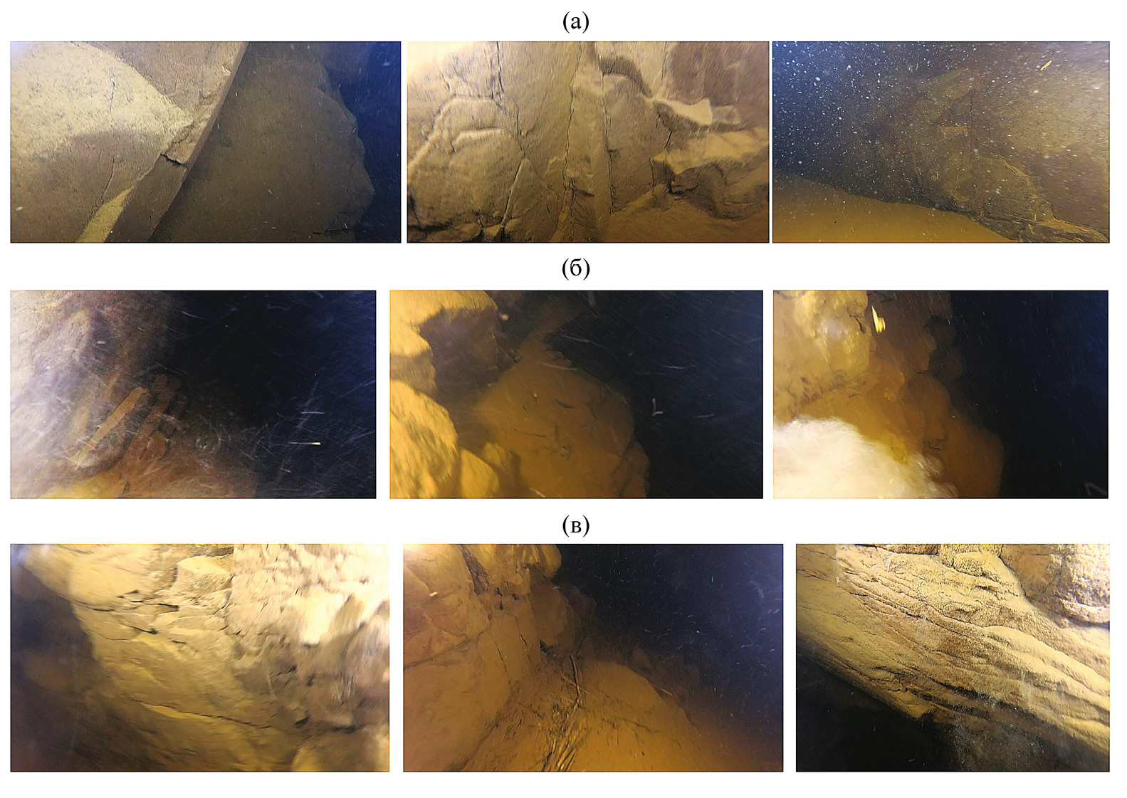 На рис. 4 представлены фотографии обнаруженных уступов в границах площади захвата фотокамеры. Схожие картины наблюдались и фиксировались на протяжении всего подъема камеры с глубин, превышающих 100 м до 20–30 м.