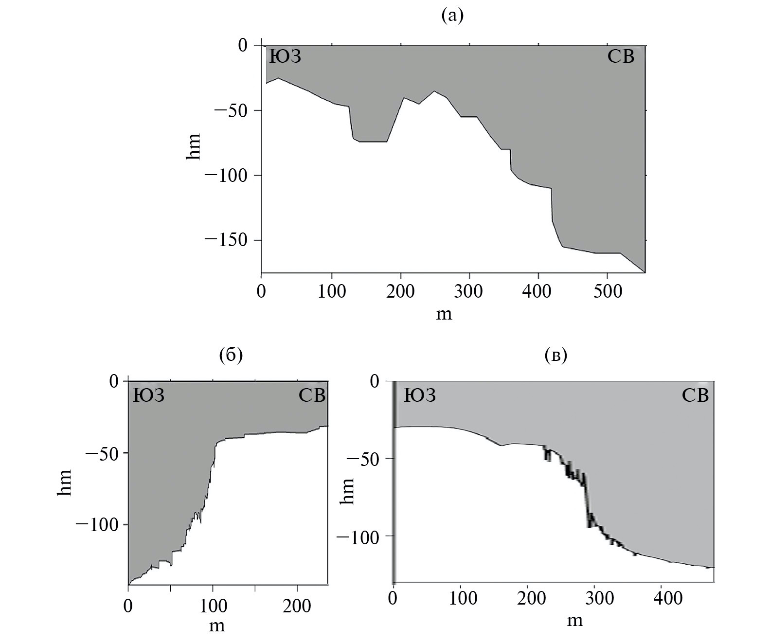 На рис. 5 изображены профили, построенные поперек всех трех уступов на основании комбинированных данных эхолота и спутникового позиционирования контактов аппарата со стенкой.
