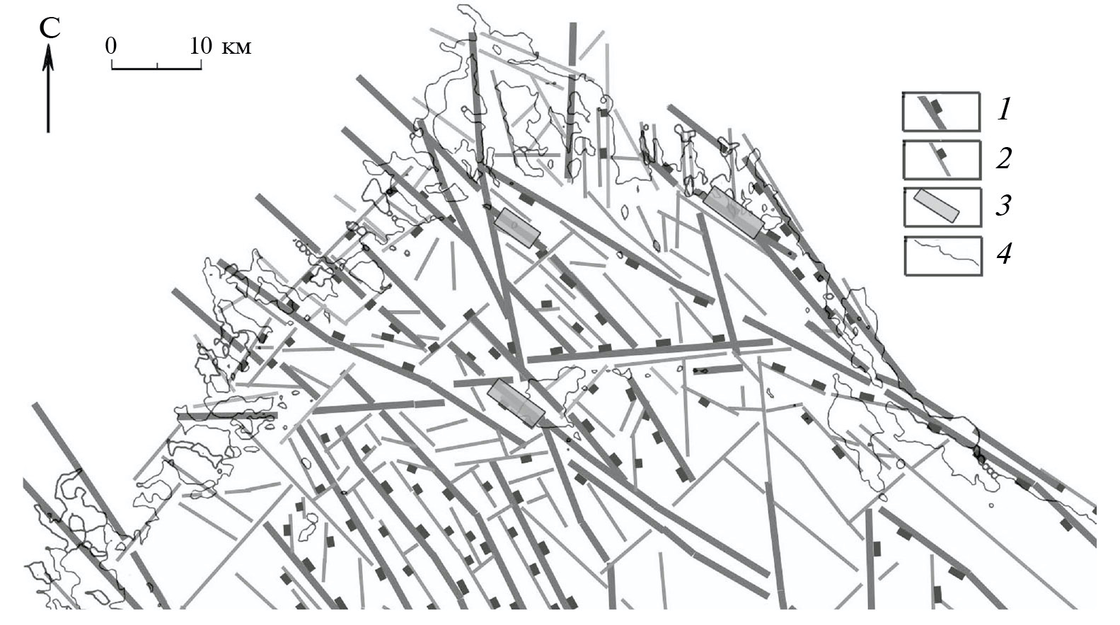 Рис. 6. Положение изучаемых субвертикальных уступов в сети разломов северной части Ладожского озера (рисовка сети разломов – В.М. Анохин и др. [8], с использованием [1, 27]: 1 – разломы 1-го порядка с указанием направления сброса, 2 – разломы 2-го порядка с указанием направления сброса, 3 – положение изучаемых уступов, 4 – береговая линия.