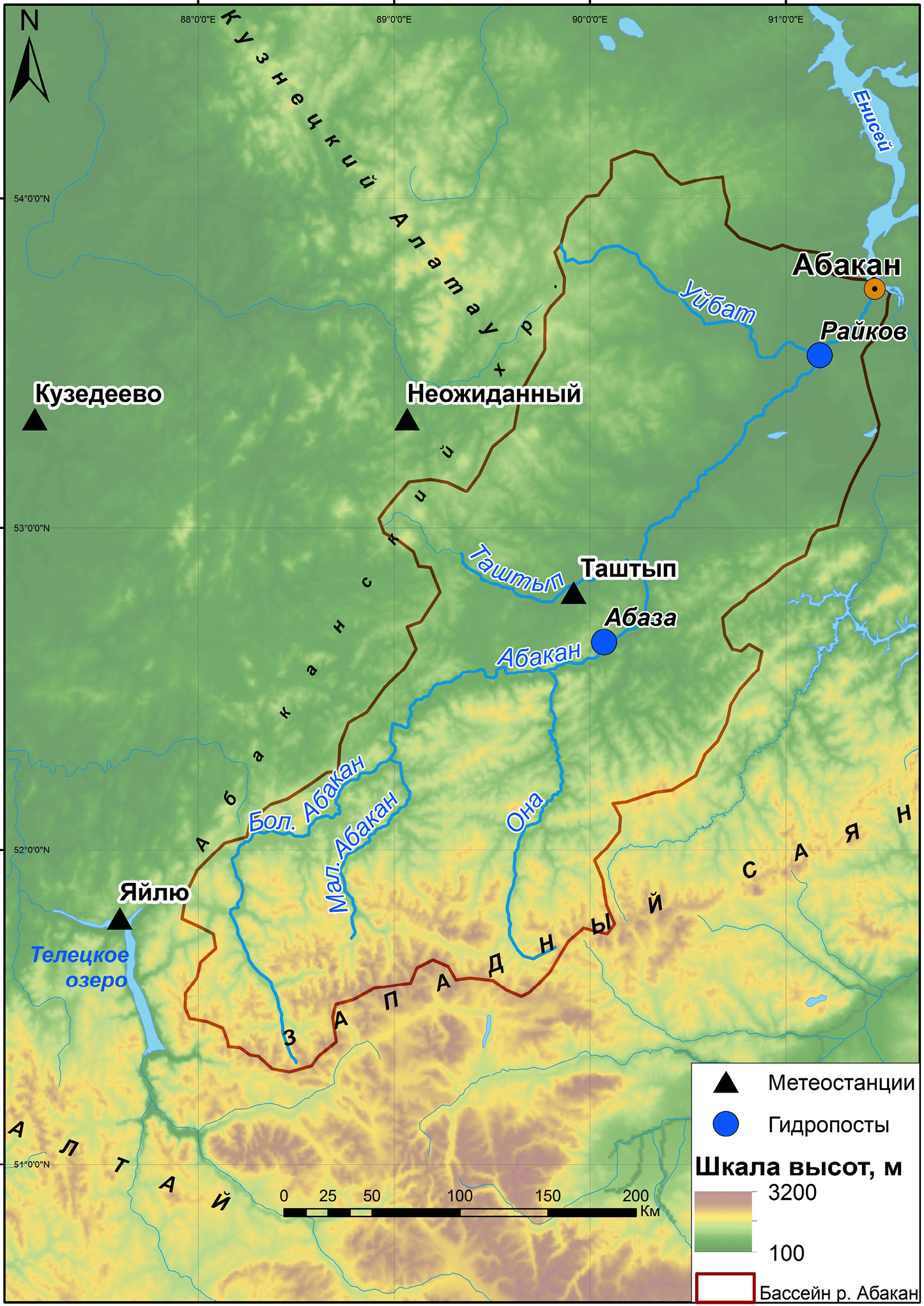 При очень низкой плотности метеостанций в данном регионе встал вопрос о выборе наиболее репрезентативной для последующего включения ее данных в схему “экстремальные осадки — экстремальный расход воды — ОГЯ (опасные гидрологические явления)” [2]. В качестве основных рассматривались метеостанции (м/с), расположенные на пути влагонесущих потоков и находящиеся на достаточно близком расстоянии от территории бассейна, особенно его горной части и на самой территории. Исходя из этого, были выбраны следующие м/с: Неожиданный, Кузедеево, Яйлю и Таштып (рис. 1). Последняя расположена непосредственно в бассейне реки Абакан, но не может считаться репрезентативной для объективной оценки суммарных осадков, особенно выпадающих в горной части бассейна, в силу нахождения достаточно далеко от нее в орографической тени и общего относительно малого количества регистрируемых осадков (в 2–2.5 раза меньше, чем на остальных м/с). Тем не менее для оценки степени взаимосвязи между всеми задействованными м/с был проведен корреляционный анализ рядов месячных и годовых сумм осадков за период 1961–2021 гг., выявивший наиболее тесную связь между м/с Яйлю и м/с Таштып. Учитывая эту связь, а также весьма близкое расположение м/с Яйлю к верхней части бассейна р. Абакан и ее удачное нахождение по направлению основного вектора влагопереноса, данная метеостанция была выбрана опорной в дальнейших расчетах. Климатические данные взяты из архива ВНИИГМИ-МЦД.