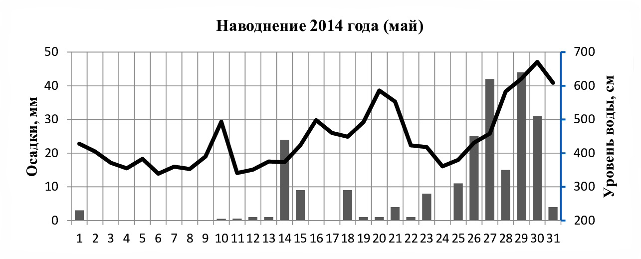 В бассейне реки Абакан наблюдается изменение внутригодовой временной структуры осадков и максимального расхода в сторону совместного статистически значимого увеличения обоих параметров именно весной, в частности, в мае. Наводнения не всегда наблюдаются в многоводный год и, наоборот, крупное наводнение может проявиться и в средневодный год. Наводнения в классах от высоких до катастрофических в большинстве случаев происходят по схеме наложения паводков на половодье. При этом паводки в основном вызываются экстремальными майскими осадками с пентадной (5-суточной) интенсивностью от 60 до 100 мм, что подтверждается и большим весом майских осадков во множественной регрессионной модели расчета максимального расхода воды.