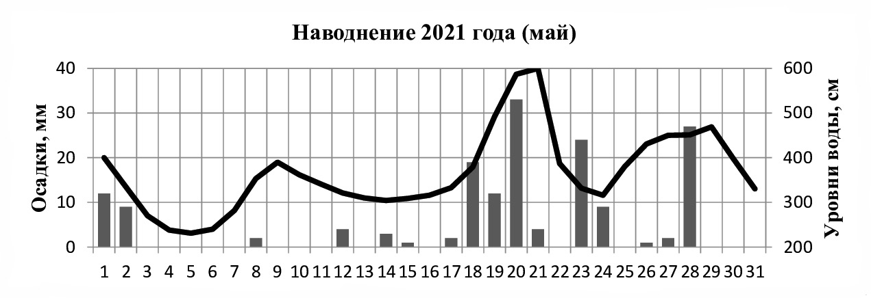 Fig. 5. The relationship between the precipitation at the Yailyu weather station and the water levels at the Abaza hydrological station in May 2021.
