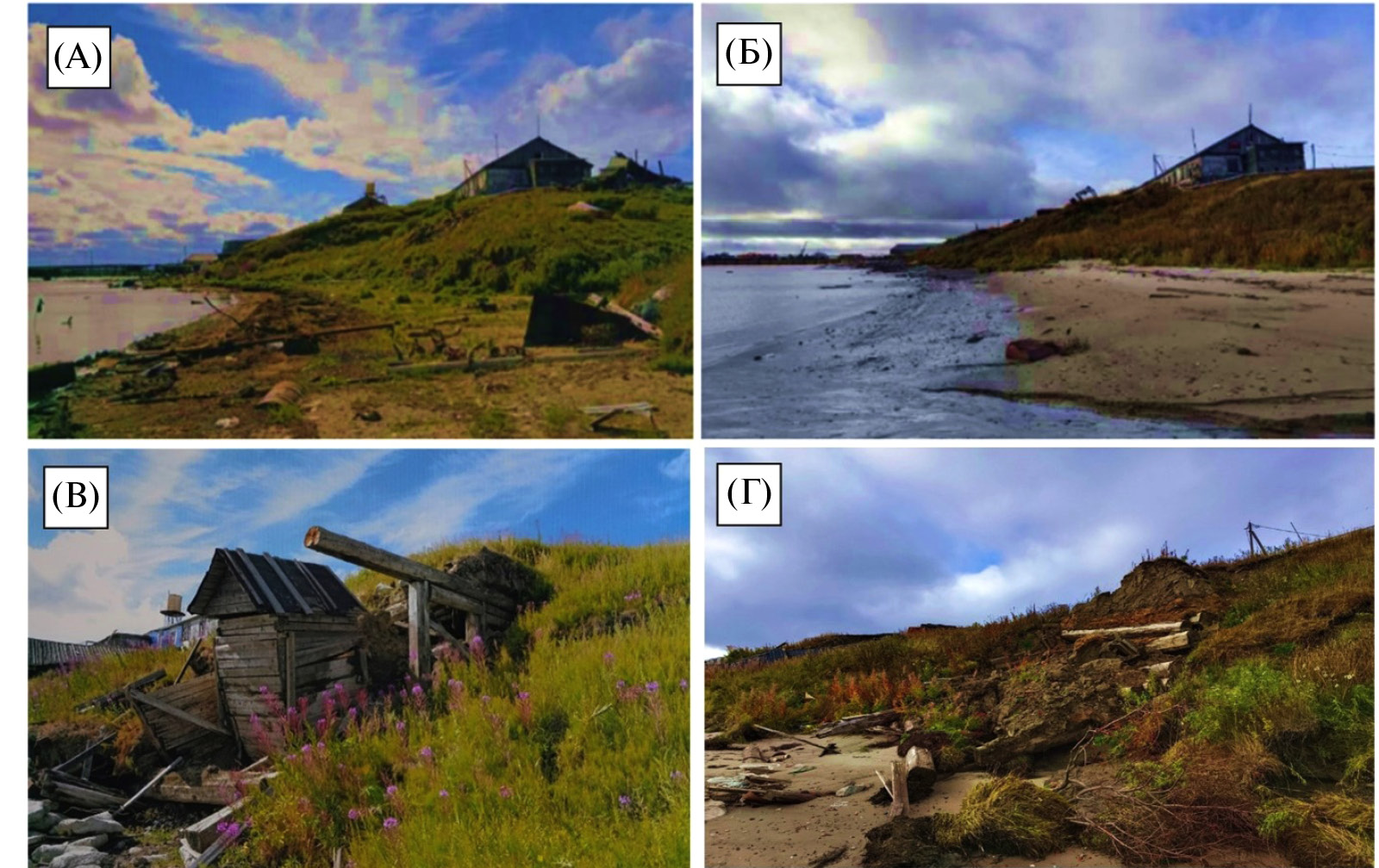 Fig. 3. “A” — Condition of the coast near the ice cellar in 2016, view from the northeast. The mudflat and laida surfaces are observed. “Б” — State of the coast near the ice cellar in 2023, view from the northeast. Laida is eroded and replaced by thin beach. “B” — Entrance No. 3 in 2016. Not used due to the threat of collapse and converted into a ventilation shaft. “Г” — Entrance No. 3 in 2023. Liquidated.