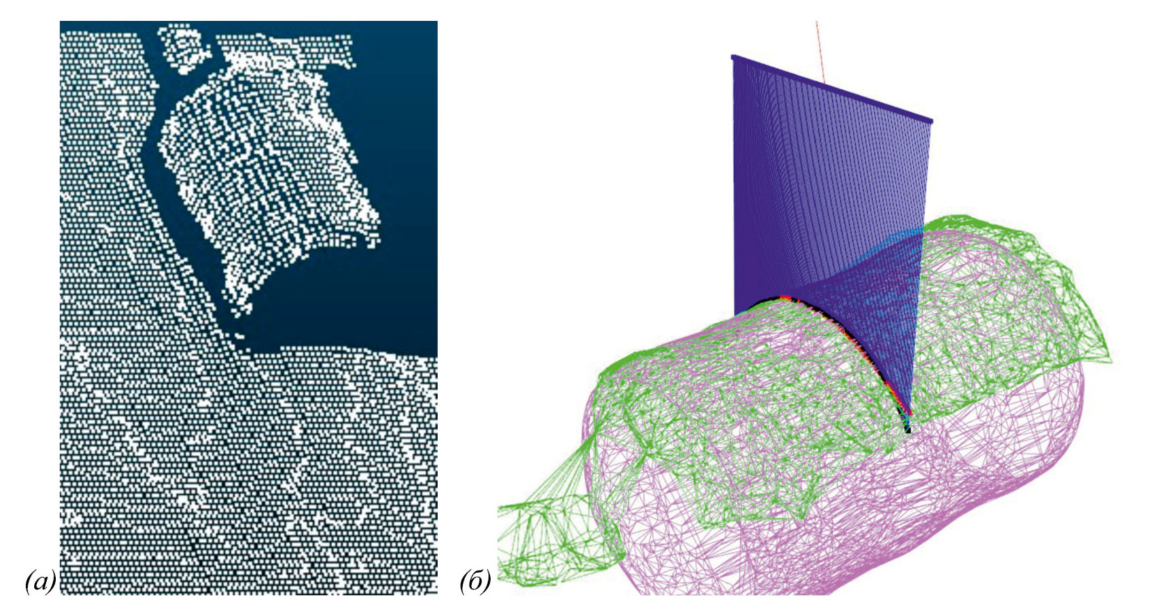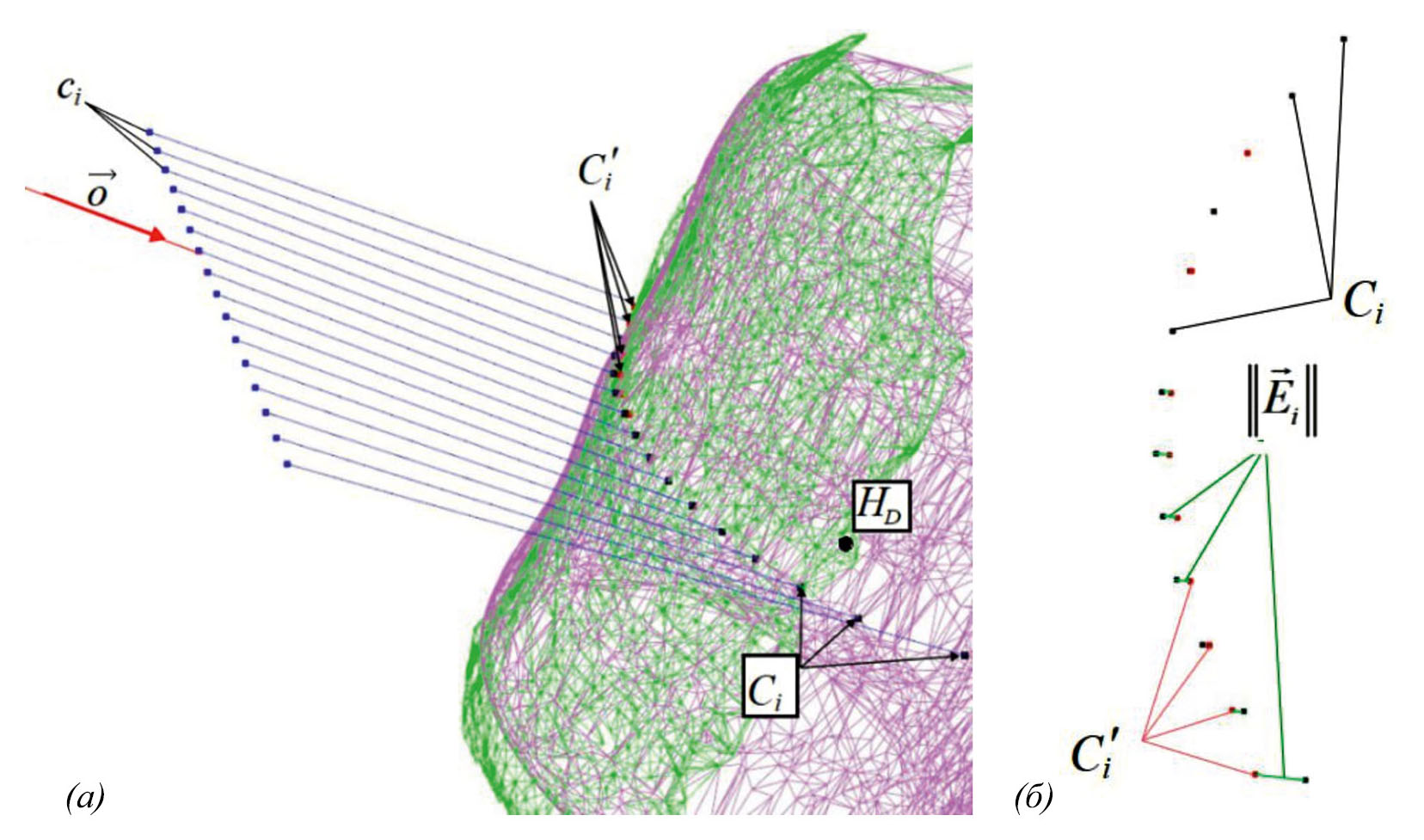 Рис. 1. Совмещение облаков точек Ci и Ciʹ (а) и точки пересечения проверочной траектории с триангуляционными поверхностями (б)