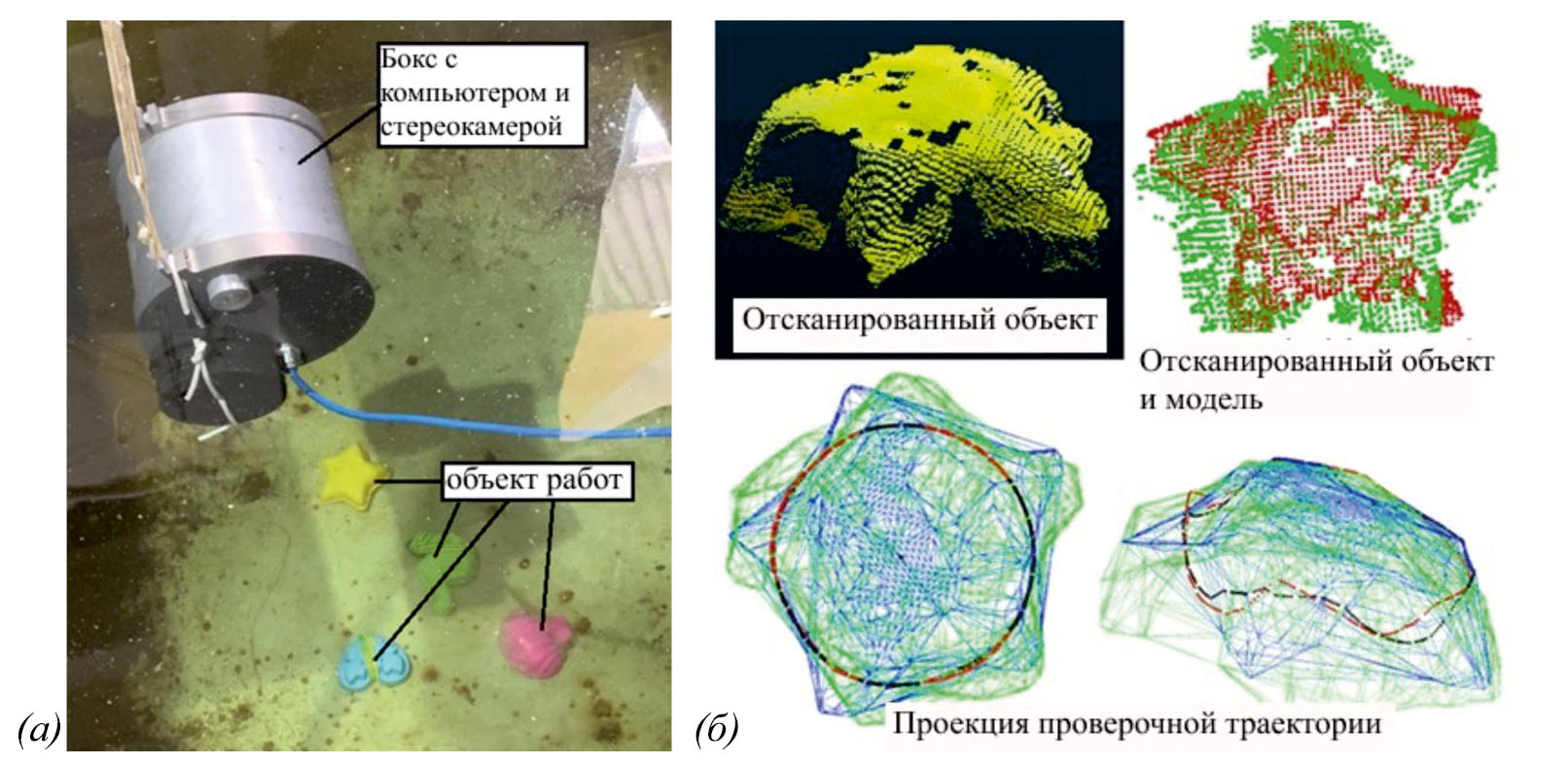 В ходе эксперимента на основе облаков точек сканируемой сцены (рис. 2, а), включающей различные объекты, успешно идентифицировался целевой объект – морская звезда (рис. 2, б). Для проверки правильности выполненного совмещения на объект проецировалась проверочная траектория в форме окружности, показанная на рис. 2, б. При этом ошибка определения расположения объекта не превышала 5 мм на расстоянии 1 м от СТЗ. Также успешно проведен эксперимент по идентификации в водной среде бочки (рис. 3, а) с последующим наложением на ее поверхность различных траекторий (рис. 3, б).