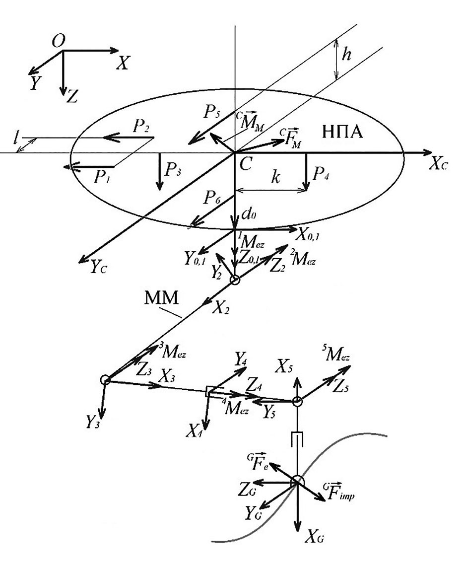 При движении рабочего инструмента подводного ММ по поверхности объекта работ на выходной вал редуктора привода i-й степени подвижности ММ (, n – количество степеней подвижности ММ) действует внешний момент iMdz, направленный вдоль оси шарнира i. iMdz = iMwz + iMez. Здесь iMwz – момент, обусловленный эффектами взаимовлияния между всеми степенями подвижности ММ, а также гидростатическими и гидродинамическими силами сопротивления его движению, включая вязкие трения и присоединенные массы окружающей жидкости, iMez – момент, обусловленный влиянием силы реакции опоры поверхности объекта работ , которая равна по величине и противоположна по направлению силе воздействия рабочего инструмента на этот объект. На рис. 4 показаны перечисленные векторы сил и моментов, а также векторы силового и моментного воздействия на НПА со стороны работающего ММ; индексом G отмечены векторы, заданные в СК , связанной с рабочим инструментом ММ; OXYZ – абсолютная СК; СXCYCZC – связанная с НПА СК; X0Y0Z0 – СК, связанная с основанием ММ; X1…5Y1…5Z1…5 – СК, связанные с началами соответствующих звеньев ММ; XGYGZG – СК, связанная с инструментом ММ; P1…6 – тяги, создаваемые движителями НПА; h, l, k – геометрические параметры компоновки движителей НПА; – вектор, определяющий положение основания ММ в СК XCYCZC.