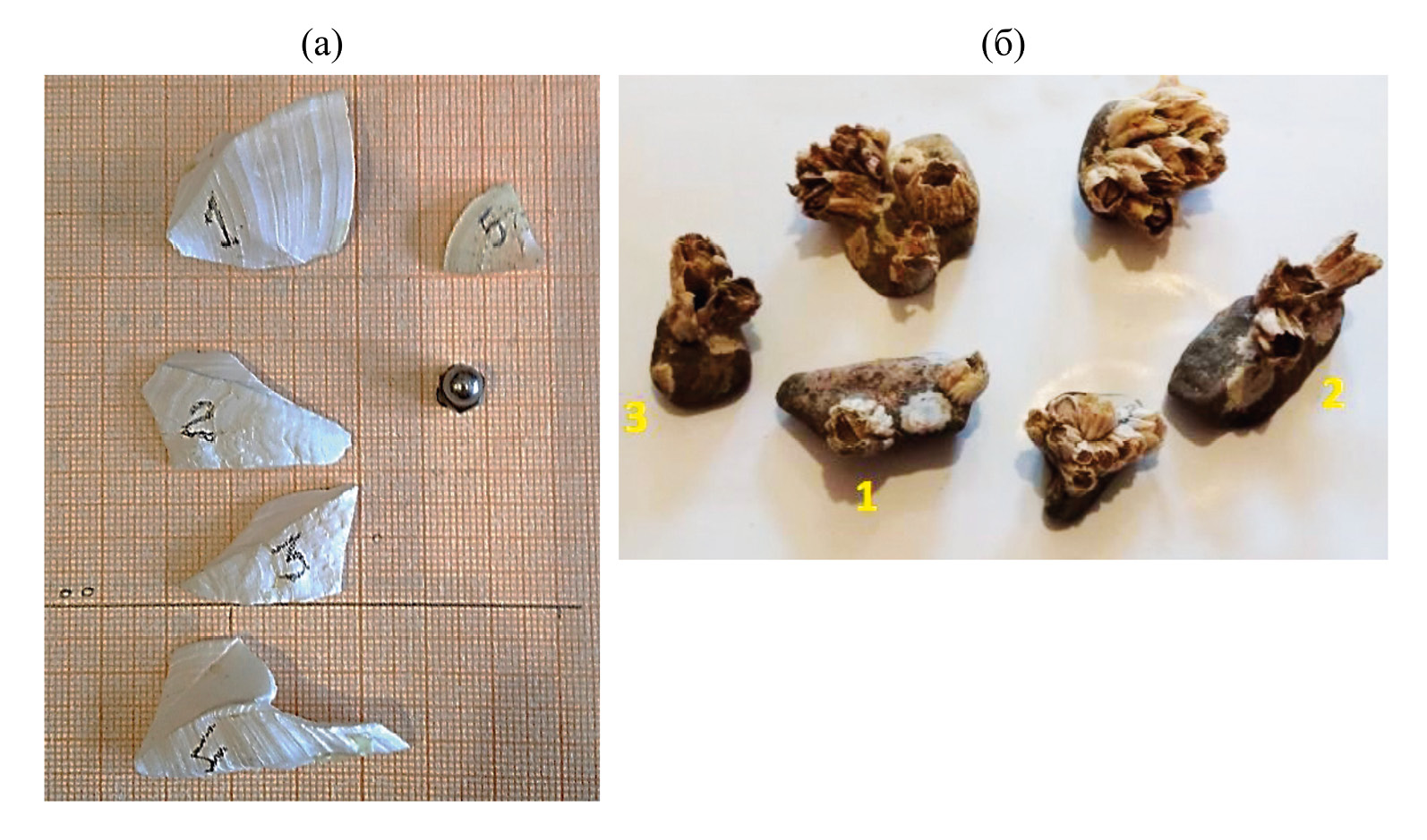 В экспериментах были использованы фрагменты домиков усоногих рачков Chirona evermanni, собранных с глубины около 100 м в Охотском море у берегов о-ва Сахалин, зафиксированные 4%-м формальдегидом, а затем высушенные (рис. 1, а), и домики Balanus eburneus, собранные в юго-восточной части Баренцева моря с глубины 20–30 м, зафиксированные 70%-м этанолом (рис. 1, б). Материал из Баренцева моря включал как отдельные домики, так и группы балянусов на природном субстрате (галька песчаника и доломита величиной 10–15 см).