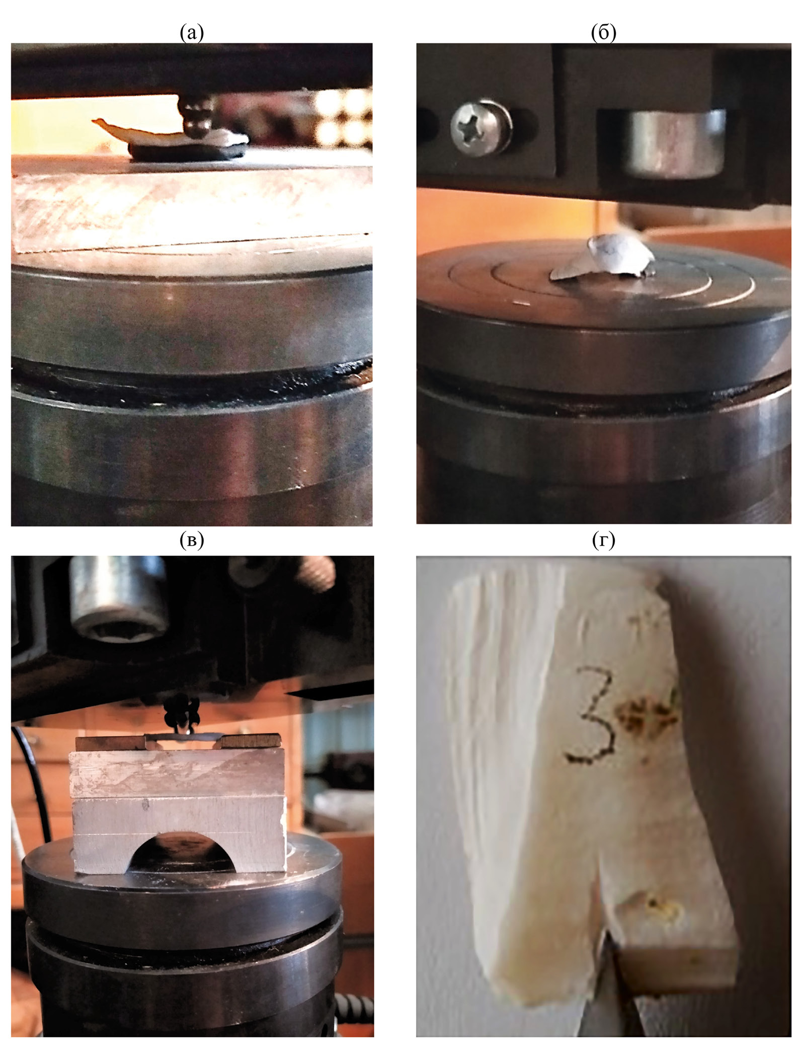 Нагружение фрагментов проводилось на прессе ДТС-06–100. Выполнялись испытания четырех видов: два – на неподготовленных образцах (рис. 2, а, б) и два –разрушение специально подготовленных образцов (рис. 2, в, г). Для второй группы (Balanus eburneus в сростках), учитывая особенности прикрепления домиков к субстрату и сложность их формы, была собрана испытательная установка с датчиками силы и перемещения, в которую помещались образцы с основаниями, предварительно закрепленными эпоксидной смолой на металлических подложках. Подложки крепились в установке.