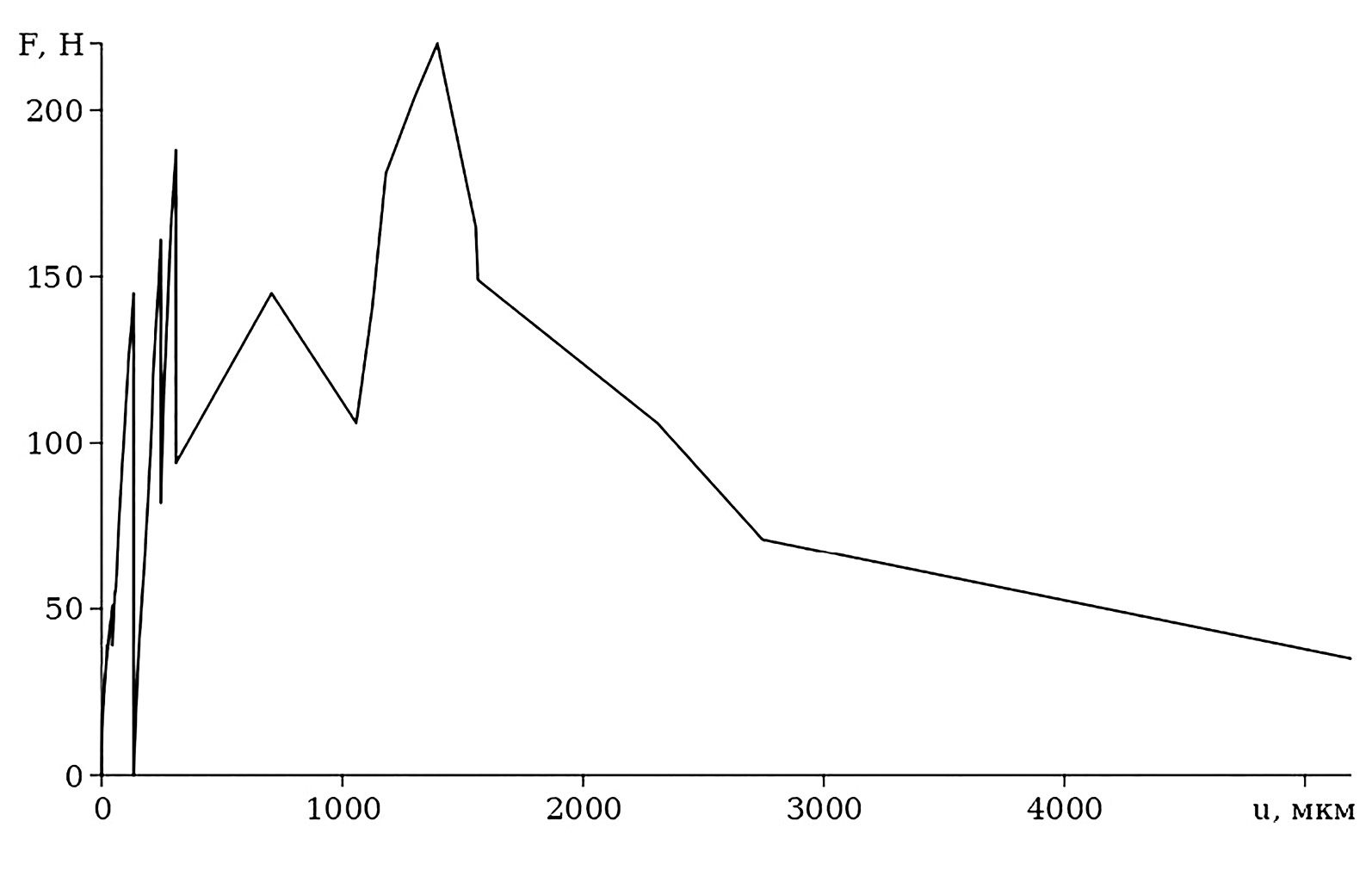 Сечение домика имело сложную волнообразную форму: толщина по сечению менялась от 1,5 до 3,2 мм, а максимальный габаритный размер сечения менялся от 3 до 6,5 мм. Установка для испытания образцов на действие боковой нагрузки состояла из рычага для приложения давления к образцу, неподвижной опоры, толкателя с измерителем силы в виде S-образного датчика и измерителя линейного перемещения с точностью 0,1 мкм. Цена деления датчика силы составляла 10 Н. По результатам испытаний был построен график зависимости силы F от перемещения и стенки образца в точке приложения силы (рис. 3). Из этого графика видно, что начальный этап нагружения сопровождался частыми сбросами силы, свидетельствовавшими о появлении мелких трещин и отламывании кусочков стенки образца. Окончательное разрушение произошло при изломе раковины в основании. Максимальная нагрузка, которую выдержал образец, была 220 Н.