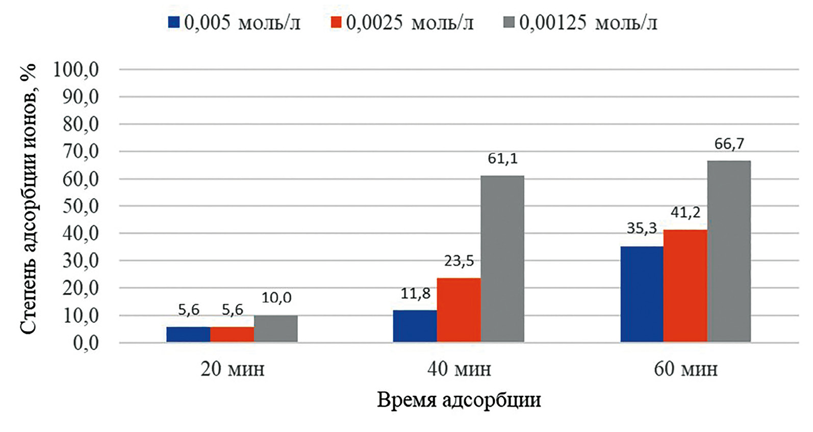 Для оценки адсорбционной способности использовали показатель – степень извлечения ионов, в% (степень адсорбции). Расчет проводили по формуле: