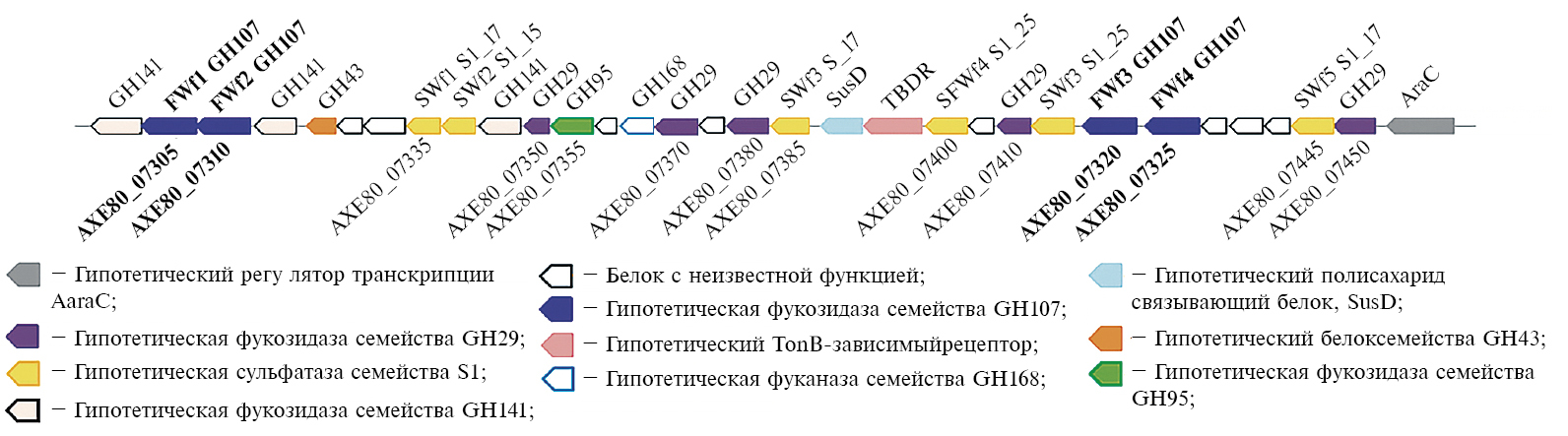 Морская бактерия W. fucanilytica CZ1127Т, изолированная из морской воды прибрежной зоны [13], способна расщеплять сульфатированные фукозосодержащие полисахариды, выделенные из различных источников, включая голотурии и бурые водоросли [14]. Геном данной бактерии содержит кластер генов, кодирующих ферменты, участвующие в деградации фукозосодержащих сульфатированных полисахаридов (рис. 1). Кластер включает четыре последовательности, кодирующие фуканазы семейства GH107, названные как FWf1, FWf2 [15], FWf3 и FWf4 [16] (далее FWf1‒FWf4).