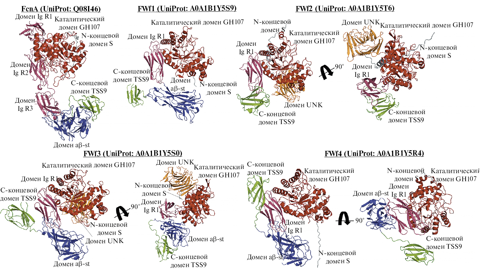 Анализ доменной организации фуканаз FWf1‒FWf4 с помощью CDD и InterProScan показал, что их полипептидные цепи состоят из доменов различных типов. Помимо каталитических доменов семейства GH107 их аминокислотные последовательности содержали кадгериноподобный домен (IgR) с иммуноглобулиноподобным типом укладки полипептидной цепи (рис. 2).