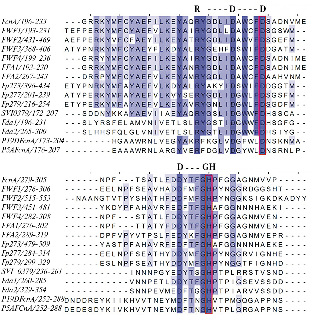 Множественное выравнивание аминокислотных последовательностей FWf1‒FWf4 и охарактеризованных фуканаз GH107 семейства: Fda1 и Fda2 (Alteromonas sp. SN-1009, GenBank: AAO00508.1 и AAO00509.1), FFA1 и FFA2 (F. algae KMM3553T, GenBank: WP_057784217.1 и WP_057784219.1), FcnA (M. fucanivorans, GenBank: CAI47003.1), P5AFcnA и P19DFcnA (Psychromonas sp. SWA5, GenBank: AYF59291.1 и AYF59292.1), Fp273, Fp277 и Fp279 (некультивируемые бактерии, GenBank: AYC81238.1, AYC81239.1 и AYC81240.1), SVI_0379 (Shewanella violacea DSS12, GenBank: BAJ00350.1) – показало, что данные фуканазы имеют различные значения идентичности их аминокислотных последовательностей (от 15 до 79%). Идентичность аминокислотных последовательностей FWf1–FWf4 между собой составляет от 37 до 51%. Множественное выравнивание позволило определить расположение каталитических аминокислотных остатков в фуканазах FWf1 (Asp225 и His293), FWf2 (Asp464 и His537), FWf3 (Asp401 и His469) и FWf4 (Asp229 и His297), входящих в состав высококонсервативных для всех известных представителей семейства GH107 аминокислотных мотивов RxxxxxxDxxxxD и DxxxGH (рис. 4).