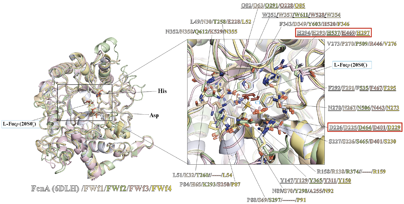 Рис. 5. Структурное выравнивание трехмерных моделей каталитических доменов GH107 фуканаз FWf1‒FWf4 и фуканазы FcnA (шифр PDB: 6DLH). Остатки аминокислот активных центров FWf1‒FWf4 и FcnA, являющиеся консервативными, подчеркнуты. Остатки Asp и His, выполняющие каталитическую функцию, выделены красными рамками