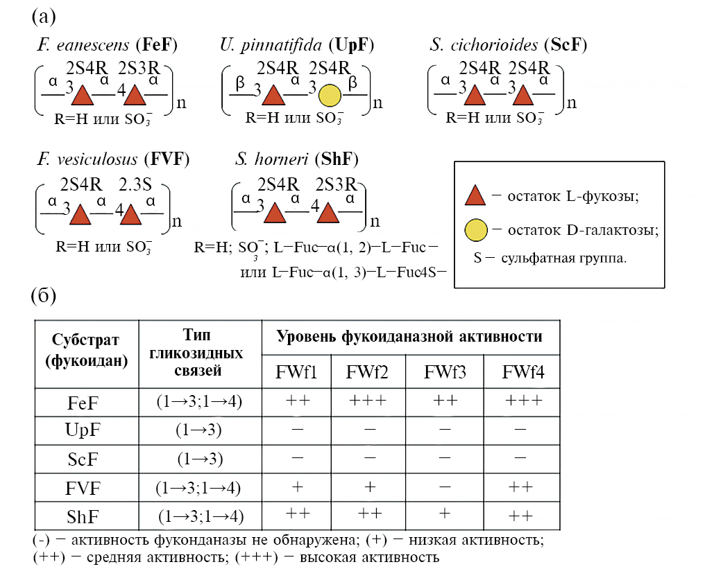 Рис. 7. Анализ активности фуканаз FWf1‒FWf4 по отношению к фукоиданам, выделенным из различных видов бурых водорослей: а – схема основных структурных мотивов, присутствующих в фукоиданах, выделенных из F. evanescens (FeF), U. pinnatifida (UpF), S. cichorioides (ScF), F. vesiculosus (FvF) и S. horneri (ShF); б – таблица, демонстрирующая уровень активности FWf1‒FWf4 по отношению к FeF, UpF, ScF, FvF или ShF