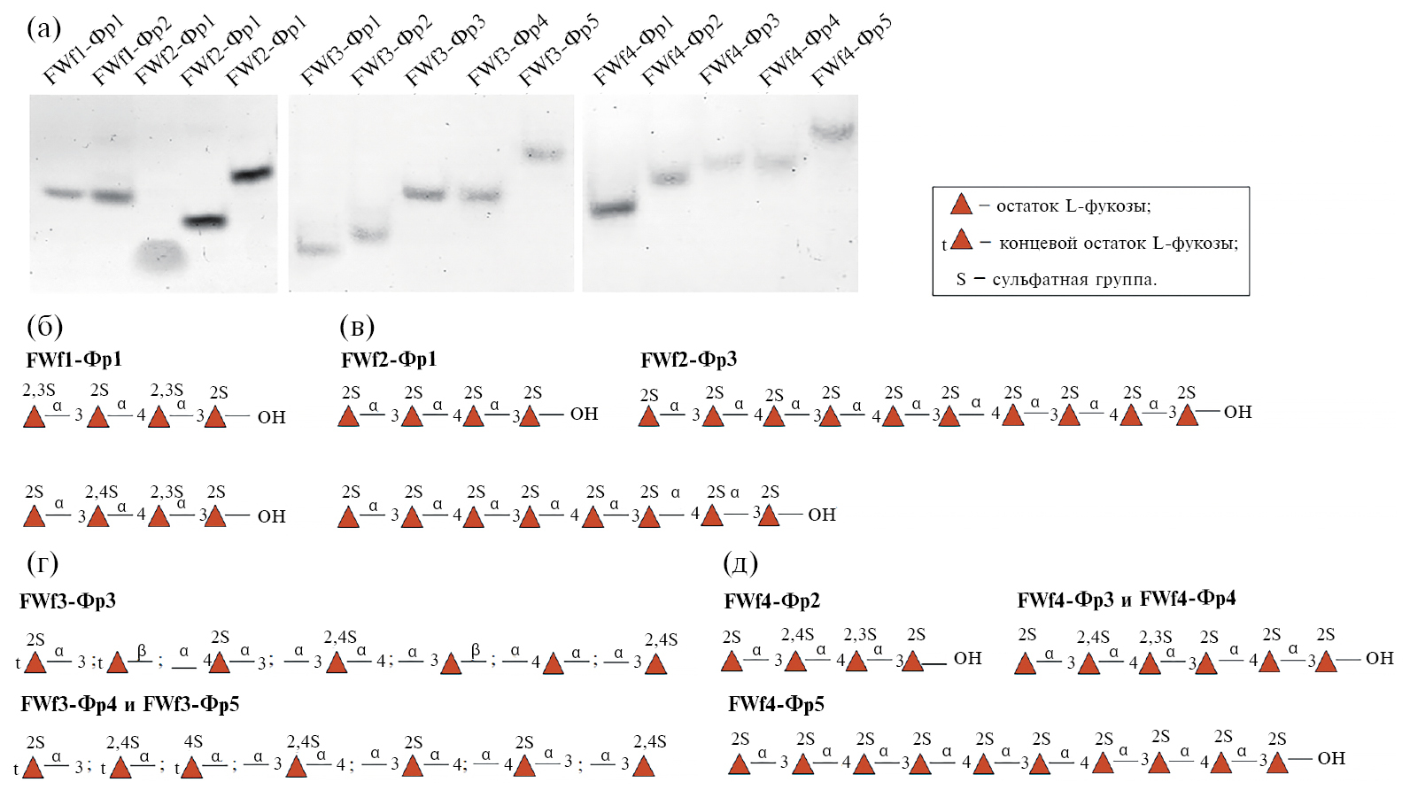 Рис. 8. Электрофореграмма (а) и схематическое изображение структур выделенных олигосахаридов – продуктов ферментативного гидролиза фукоидана FeF, полученных с помощью фуканаз FWf1 (б), FWf2 (в), FWf3 (г) и FWf4 (д)