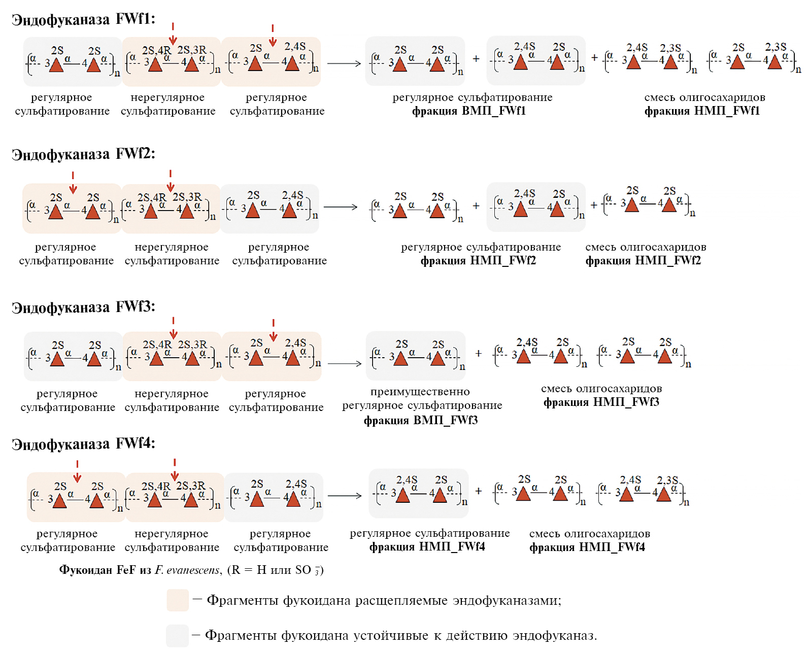 Рис. 9. Схематическое изображение деполимеризации фукоидана FeF с помощью FWf1‒FWf4. Красная стрелка указывает на сайты в FeF, которые фуканазы FWf1‒FWf4 распознают и расщепляют