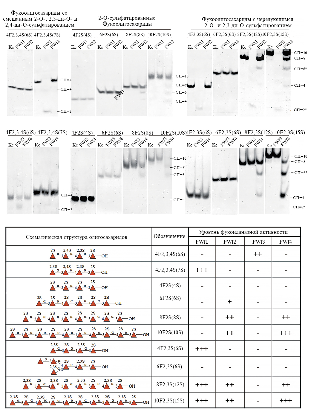 Углеводсвязывающие подсайты фуканаз были установлены с помощью набора сульфатированных фукоолигосахаридов: 4F2,3,4S(6S), 4F2S(4S), 8F2S(8S), 10F2S(10S), 4F2,3,4S(7S), 4F2,3S(6S), 6F2S(6S), 6F2,3S(6S), 8F2,3S(12S), 10F2,3S(15S). Все вышеперечисленные олигосахариды состоят из остатков α-L-фукозы, связанных чередующимися 1→3-;1→4-гликозидными связями, но отличаются степенью полимеризации (СП) и расположением сульфатных групп при остатках α-L-фукозы. Активность фуканаз FWf1‒FWf4 по отношению к этим фукоолигосахаридам значительно различается (рис. 10) и зависит от определенного расположения сульфатных групп, а также степени полимеризации олигосахаридов.