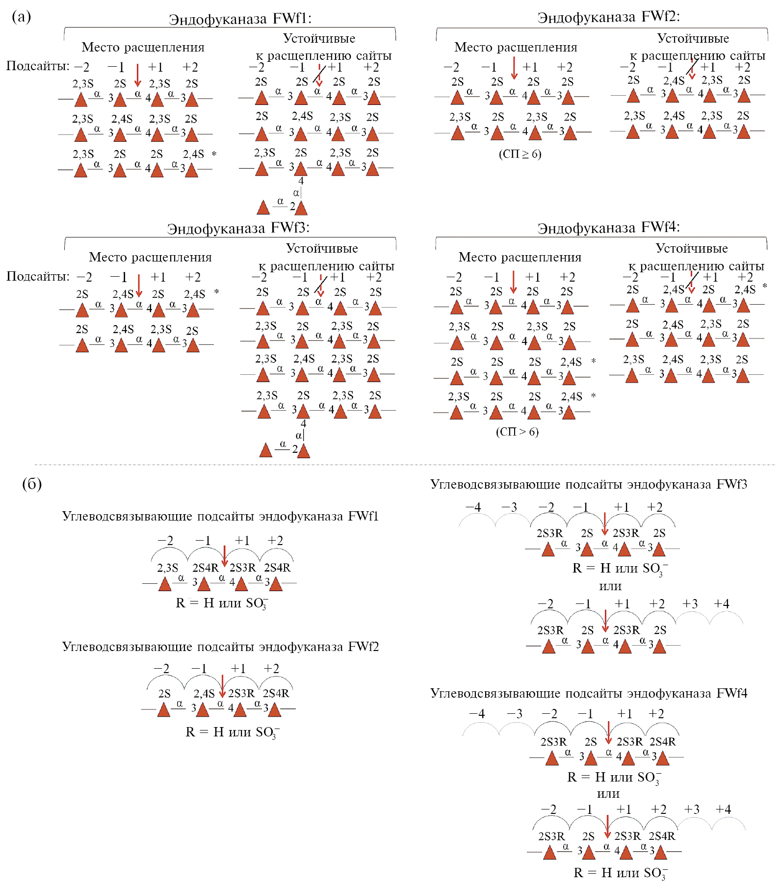 Рис. 11. Предполагаемые сайты расщепления фукоидана, распознаваемые эндофуканазами FWf1‒FWf4, и структурные мотивы фукоидана, устойчивые к расщеплению фуканазами FWf1‒FWf4 (а). Топология предполагаемых углеводсвязывающих подсайтов фуканаз FWf1‒FWf4 (б). Цифры над структурными мотивами указывают на углеводсвязывающие подсайты FWf1‒FWf4. Подсайты пронумерованы в соответствии с номенклатурой [42]. Звездочка обозначает сайт расщепления, предполагаемый на основании структур олигосахаридов, полученных в результате гидролиза фукоидана FeF с помощью FWf1, FWf3 или FWf4