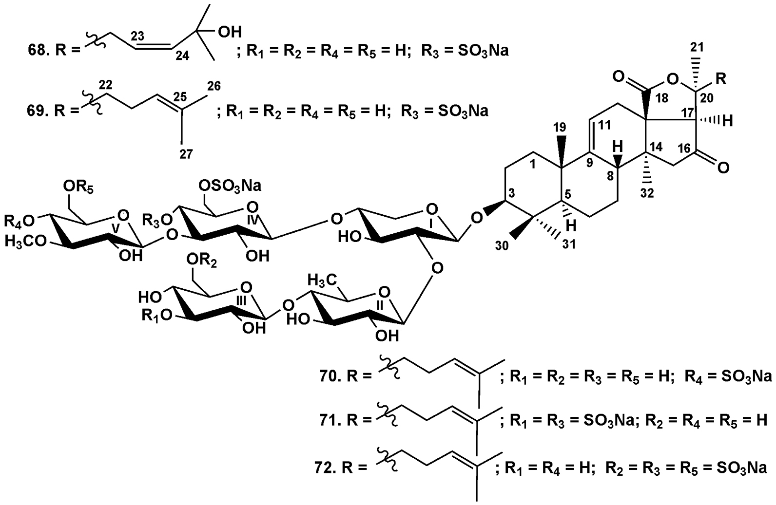 Рис. 12. Химические структуры гликозидов, выделенных из Paracaudina chilensis: 68 – хиленсозид A; 69 – хиленсозид A1; 70 – хиленсозид B; 71 – хиленсозид C; 72 – хиленсозид D