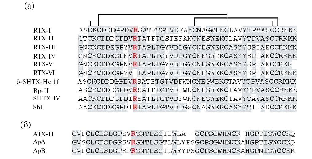 Рис. 1. Множественное выравнивание аминокислотных последовательностей нейротоксинов: структурного типа 2 – RTX-I (P30831) [5], RTX-II (P30783) [6], RTX-III (P30832) [4], RTX-IV (P30784) и RTX-V (P30785) [7] из H. crispa, Rp-II (P01534) из R. paumotensis [9], SHTX-IV (В1В519) [10] из Stichodactyla haddoni, Sh1 (З19651) [8, 11] из Stichodactyla helianthus (а); структурного типа 1 – ATX-II (P01528) [12] из Anemonia sulcata, ApA (P01530) [13], ApB (P01531) [14] из Anthopleura xanthogrammica (б). На сером фоне показаны идентичные аминокислотные остатки, на белом – точечные замены остатков в последовательностях, красным цветом – функционально значимый для связывания с NaV остаток Arg13 [8]. Прямые линии в верхней части рисунка показывают соединение С1-С5, С2-С4, С3-С6 в дисульфидных мостиках между остатками цистеина (показаны жирным шрифтом). Элайнмент выполнен с помощью программы Vector NTI