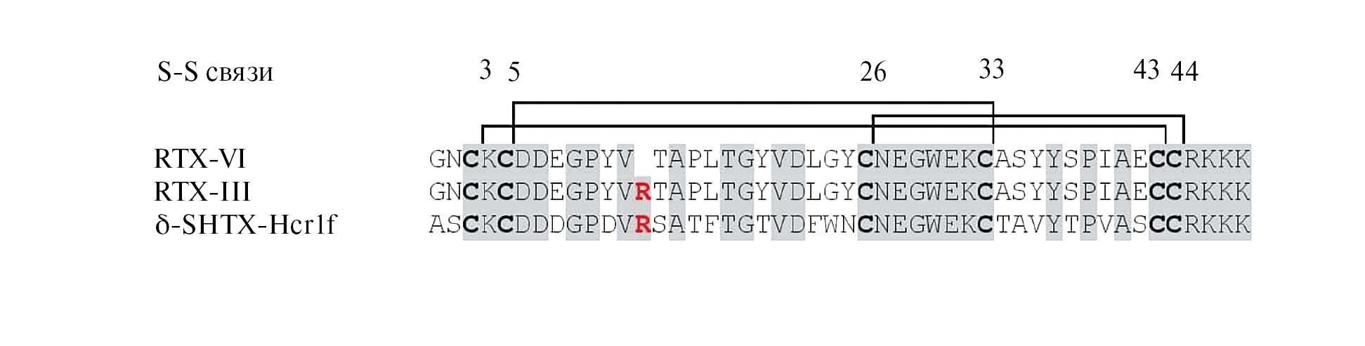 Рис. 2. Множественное выравнивание высокогомологичных аминокислотных последовательностей Heteractis нейротоксинов RTX-VI, RTX-III и δ-SHTX-Hcr1f (=Rp-II). На сером фоне показаны идентичные остатки в последовательностях, на белом фоне – точечные замены остатков, красным цветом – функционально значимый для связывания с NaV остаток Arg13 [8]. Прямые линии в верхней части рисунка показывают соединение дисульфидных связей С1-С5 (а.о. 3-43), С2-С4 (а.о. 5-33), С3-С6 (а.о. 26-44) между остатками цистеина (показаны жирным шрифтом). Элайнмент выполнен с помощью программы Vector NTI