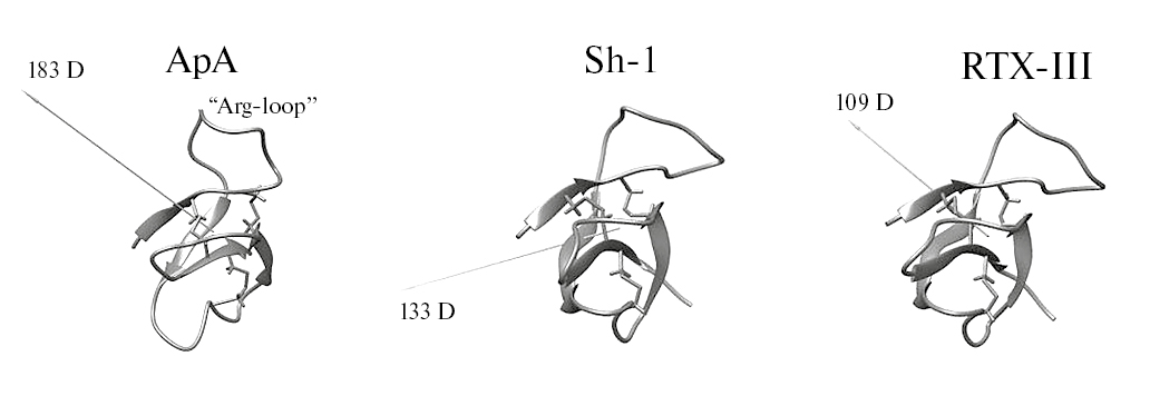 Высокое подобие аминокислотных последовательностей, идентичная локализация дисульфидных S–S связей и наличие консервативных остатков у нейротоксинов типа 1 и типа 2 (рис. 1, а, б; 2) позволили сделать заключение об их общем анцестральном гене [8]. Хотя до сих пор отсутствуют данные о 3D-структурах, установленных экспериментально, высокая гомология аминокислотных последовательностей нейротоксинов морских анемон обеспечивает наличие у всех представителей характерного дефензин-подобного фолда с близкой вторичной структурой (рис. 3) [15]. Согласно in silico расчетным данным вторичная структура нейротоксинов состоит из четырех β-тяжей и трех петель, одна из которых, так называемая Arg14 loop (для нейротоксинов типа 1), как было показано позже, обеспечивает аффинность их связывания с сайтом 3 NaVs и селективность по отношению к различным подтипам каналов [8].