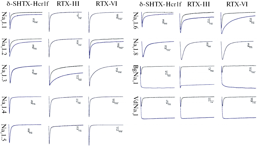 Действие нейротоксинов Rp-II (=δ-SHTX-Hcr1f), RTX-III, RTX-VI и ATX-II (10 мкМ) на токи каналов млекопитающих (NaV1.1‒NaV1.8), насекомых (BgNaV1) и арахнид (VdNaV1), экспрессированные в яйцеклетках Xenopus laevis [15]