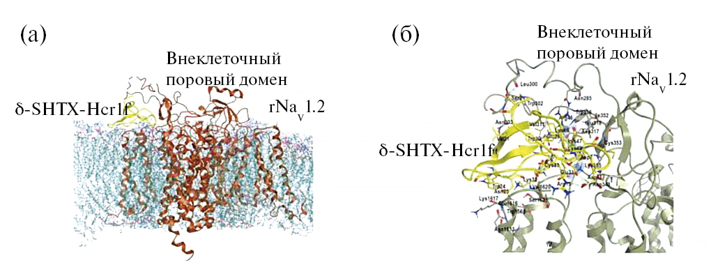 Рис. 5. Взаимодействие δ-SHTX-Hcr1f (=Rp-II) c rNaV1.2: ленточная диаграмма комплекса δ-SHTX-Hcr1f–rNaV1.2 в ДПФХ липидном бислое; молекулярные поверхности δ-SHTX-Hcr1f окрашены в желтый, rNaV1.2 – в бордово-коричневый, ДПФХ – в голубой цвет (а); межмолекулярные взаимодействия в комплексе δ-SHTX-Hcr1f–rNaV1.2 – желто-зеленоватый цвет, показаны участвующие в связывании боковых цепей нейротоксина и канала водородные связи (зеленый пунктир), ионные и π-катионные взаимодействия (синие и оранжевые контуры соответственно) (б) [15]