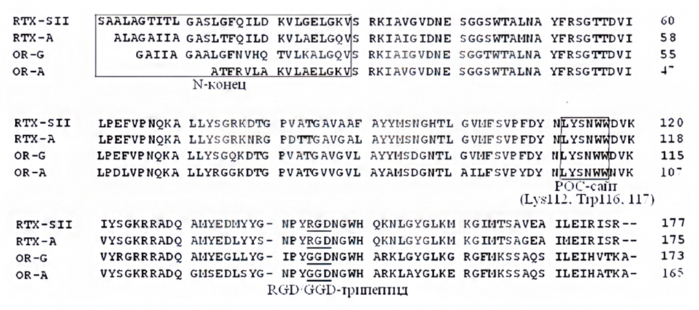 Первые представители α-пороформирующих токсинов морских анемон (называвшихся первоначально гемолизинами и/или цитолизинами в силу способности формировать в цитоплазматических мембранах эукариотических клеток водопроницаемые поры, завершающиеся лизисом мембран и гибелью клеток) были выделены из водных гомогенатов животных в начале 70-х годов прошлого столетия [18–20]. Различными хроматографическими методами из R. macrodactylus (H. crispa) выделено в высокоочищенном состоянии четыре Radianthus (Heteractis) актинопорина, RTX-A, RTX-S, RTX-SII, RTX-G [21], а из Oulactis orientalis – два актинопорина, Or-A и Or-G [22]. На основании установленных нуклеотидных последовательностей кодирующих генов выведены полные аминокислотные последовательности полипептидов RTX-SII [23, 24], RTX-А [25], Or-A и Or-G [26] (рис. 6). Позже было показано, что Heteractis актинопорины принадлежат к мультигенному семейству [27].