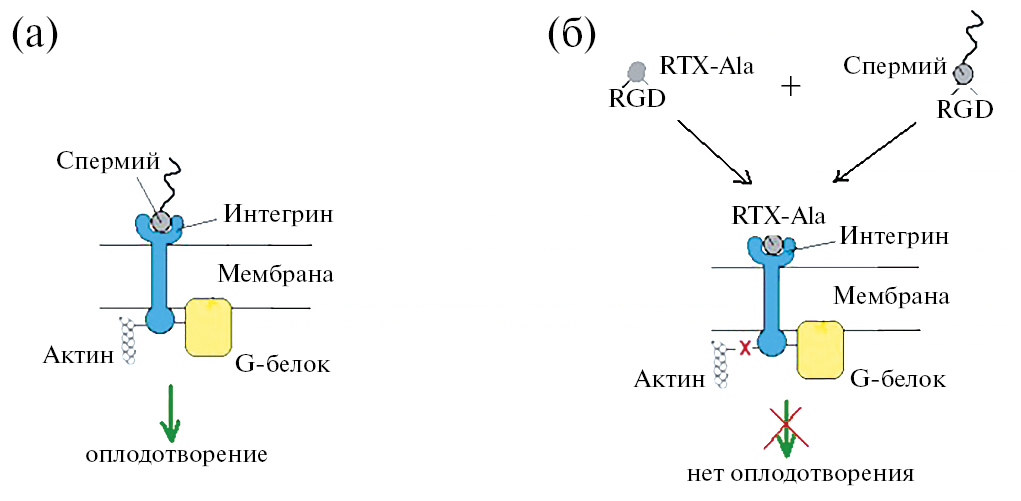 Очевидно, что такое взаимодействие RGD-мотива с интегрином αVβ3 объясняет способность актинопоринов ингибировать/блокировать процессы оплодотворения яйцеклеток спермой у морского ежа S. intermedius (поверхность головки сперматозоидов содержит трипептид RGD) (рис. 9, а, б) [39]. Согласно литературным данным, механизм оплодотворения яйцеклеток обусловлен связыванием трипептида RGD сперматозоидов с β-цепью мембранных интегринов яйцеклеток, αVβ3 и/или αVβ5 (рис. 9, а) [39], вызывающим разрыв связи интегрина с мембранным актином. Обнаруженный ранее разрыв связи между эритроцитарными интегринами и актином (рис. 8, в), основным белком цитоскелета, происходит под действием RGD-мотива актинопорина, а вымывание актина из мембраны ооцита, аналогичное происходящему в эритроцитах (рис. 8, в), ингибирует процесс оплодотворения яйцеклеток сперматозоидами (рис. 9, б).