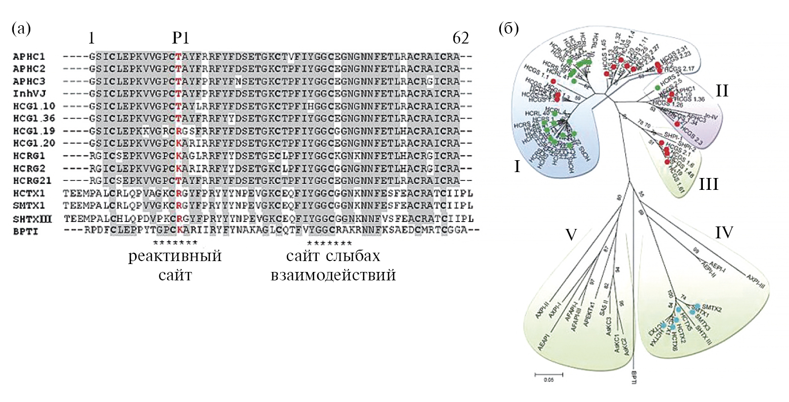Рис. 10. Множественное выравнивание аминокислотных последовательностей пептидов Кунитца морской анемоны H. crispa: APHC1, APHC2, APHC3, InhVJ, HCRG1, HCRG2, HCRG21, HCGS 1.10, HCGS 1.19, HCGS 1.20, HCGS 1.36, HCTX1, токсинов анемоны Stichodactyla mertensii SMTX1 и SMTX A49E, Stichodactylа helianthus SHTXIII, а также ингибитора трипсина BPTI из B. taurus; идентичные а.о. показаны на темно-сером фоне, консервативные – на светло-сером (а). Филогенетическое дерево пептидов Кунитц-типа из морских анемон семейств Actiniidae и Stichodactylidae, построенное методом минимальной эволюции; представители комбинаторной библиотеки H. crispa формируют на дереве четыре кластера: I–III представлены HCGS-/HCRG-пептидами, IV – HCTX-пептидами; HCGS-пептиды обозначены красными кружками, HCRG-пептиды – зелеными, HCTX/SMTX-пептиды – голубыми; последовательности пептидов с P1Lys показаны на синем фоне, с P1Thr – на розовом фоне, с P1Arg – на зеленом фоне [42] (б)