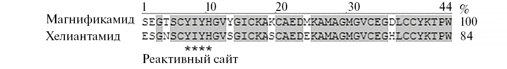 Протеомный анализ ядовитого секрета H. magnifica, проведенный методами хроматографии и масс-спектрометрии, позволил обнаружить в токсической фракции и идентифицировать 326 пептидов, относящихся к нейротоксинам различных семейств, ингибиторам протеаз Кунитц-типа, дефензин-подобным ингибиторам α-амилаз [53]. Так, недавно из H. magnifica [54] выделен в индивидуальном состоянии новый нетоксичный пептид, магнификамид (4,7 кДа, 44 а.о.), обладающий высокой степенью гомологии с известным β-дефензином из S. helianthus, хелиантамидом [55] (рис. 12), который является ингибитором панкреатической α-амилазы, участвующей в развитии диабета второго типа. Наличие высокой ингибиторной активности по отношению к различным α-амилазам свидетельствует о возможном фармакологическом потенциале магнификамида [54].