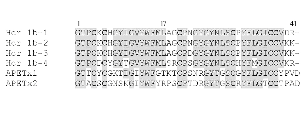 Известно, что ASICs участвуют в восприятии кислотоопосредованной, воспалительной и постоперационной боли, обусловленных патологическими процессами [57, 58]. Электрофизиологическое исследование пептидов Hcr 1b-1–Hcr 1b-4 на ASICs каналах показало наличие ингибирующего (для всех пептидов) и/или потенцирующего (для Hcr 1b-4) эффектов, поэтому их отнесли к группе APETx-подобных пептидов, которые, в отличие от токсинов APETx1 и APETx2, нетоксичны in vivo даже в высоких концентрациях [59].