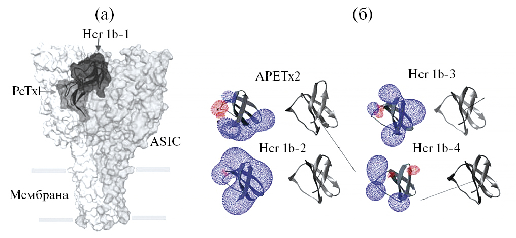 Рис. 14. Модель 3D структуры комплекса Hcr 1b-1–ASIC (а). Ленточные диаграммы моделей 3D структур молекул APETx2, Hcr 1b-2, Hcr 1b-3 и Hcr 1b-4 (б) [56, 59]. Дипольные моменты молекул показаны стрелками, эквипотенциальные поверхности (молекулярные электростатические потенциалы – МЭП) окрашены в розовый цвет (отрицательный потенциал) и синий (положительный), выполнены с помощью программ SPDBV и Chimera