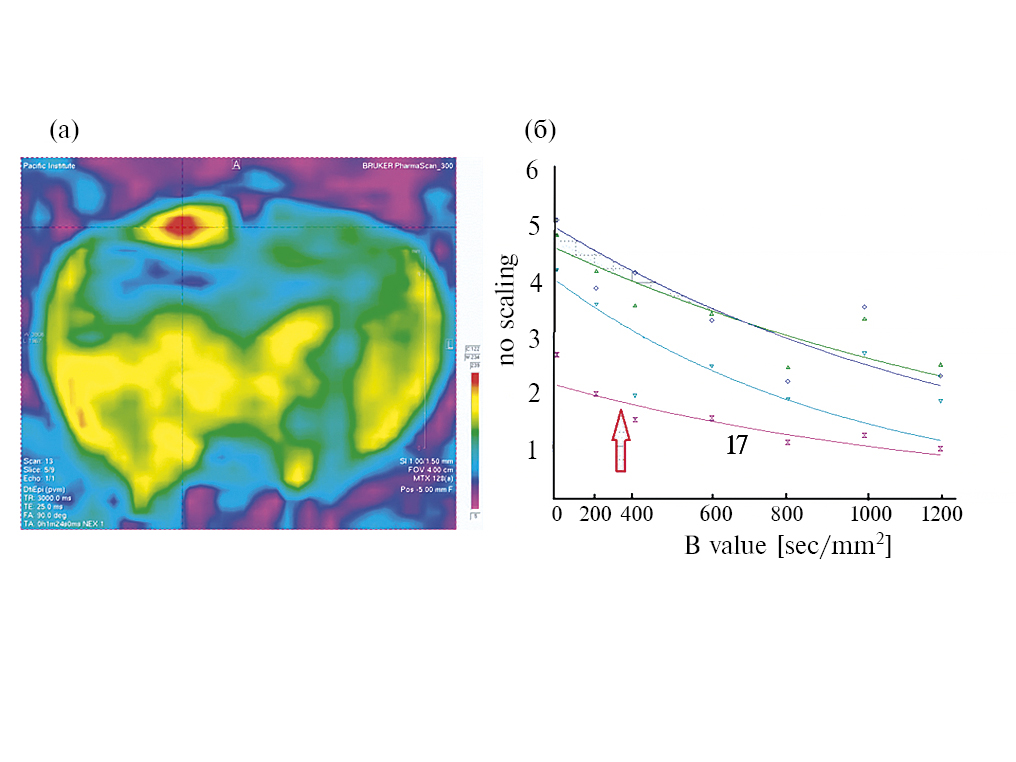 Рис. 2. Визуальная оценка интенсивности сигнала на диффузионном изображении аксиального среза головного мозга крысы, полученного методом МРТ; на участках, выделенных желто-красным цветом, скорость диффузии выше, по сравнению с участками, представленными синим цветом (а). Количественное определение скорости диффузии воды, выполненное с помощью измерения коэффициента диффузии; снижение диффузии отмечено на графике розовой линией, указанной стрелкой (б)