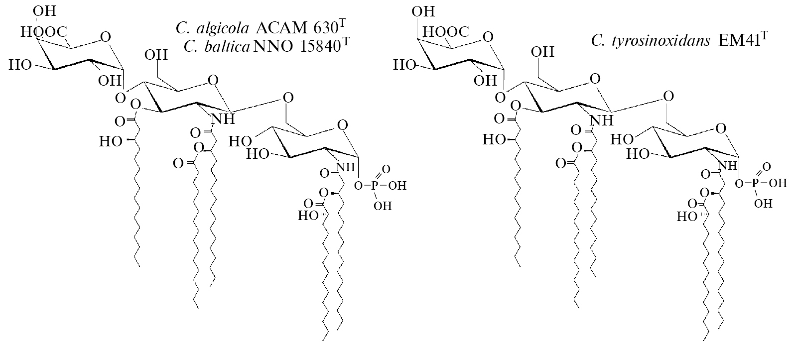 Для трех бактерий, C. algicola ACAM 630T, C. baltica NNO 15840T и C. tyrosinoxydans EM41T, были установлены структуры липида А (рис. 3). Показано, что липиды А C. algicola ACAM 630T и C. baltica NNO 15840T представляют собой сложную гетерогенную смесь, из которой превалирующие формы состоят из трисахаридного остова, декорированного одной фосфатной группой и ацилированного двумя 17:0(3-OH), одной 16:0(3-OH), одной 15:0(2-OH) и одной 16:0 жирными кислотами. Липид А C. tyrosinoxydans EM41T отличается от них одной ацильной цепью, а именно 16:0(3-OH) кислотой в положении 2΄. Исследование иммуностимулирующей активности показало, что ЛПС из штаммов C. baltica NNO 15840T и C. tyrosinoxydans EM41T проявляют более низкую активацию TLR4 по сравнению с ЛПС из S. typhimurium, в то время как действие ЛПС из C. algicola ACAM 630T сравнимо с действием ЛПС S. typhimurium. Данный эффект можно объяснить присутствием в составе ЛПС C. algicola ACAM 630T минорных дифосфорилированных изоформ липида [72].