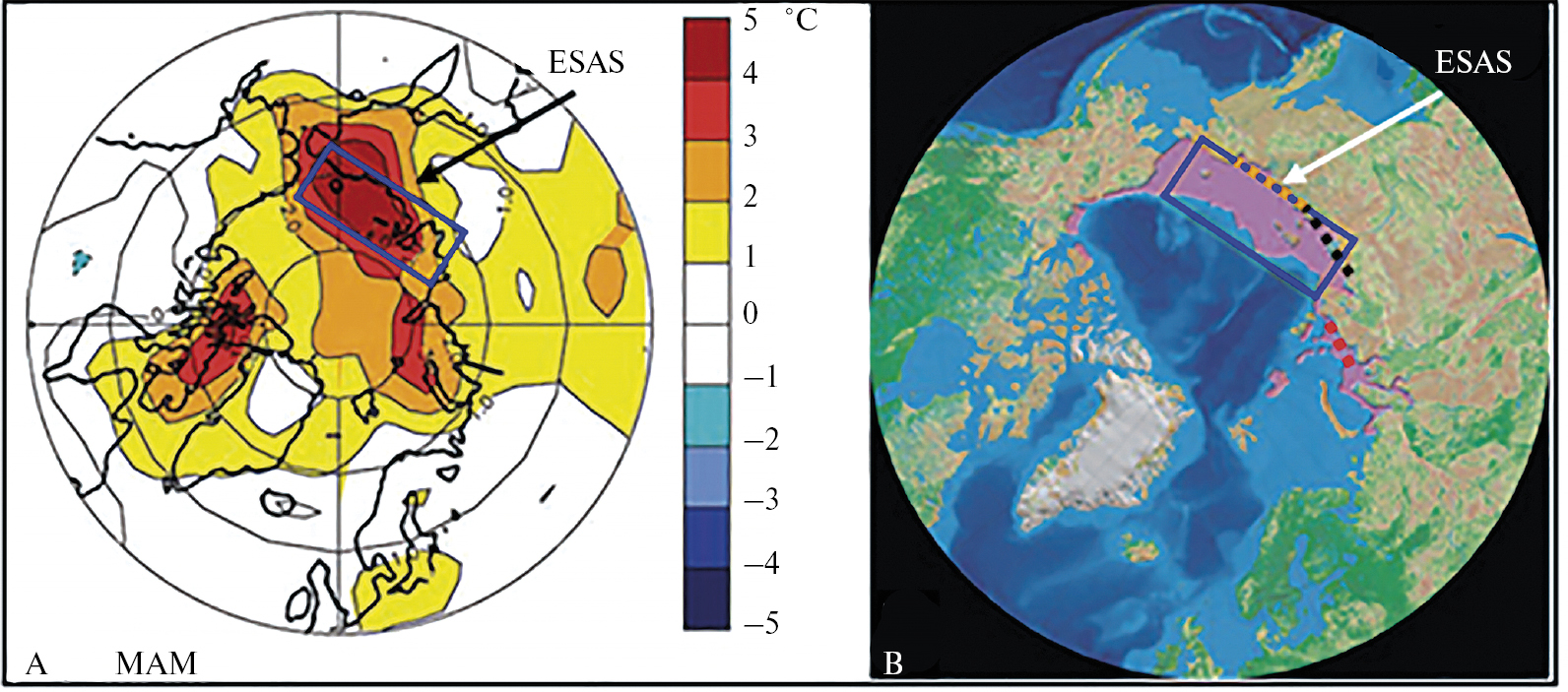Рис. 1. Аномалии в увеличении температуры воздуха в первой декаде XXI в., зарегистрировано над акваторией МВА (или ESAS: East Siberian Arctic Shelf) и прилежащей части суши (А); распределение подводной мерзлоты Арктики (окрашено в сиреневый цвет) (В). Модифицировано на основе работ [16–20].