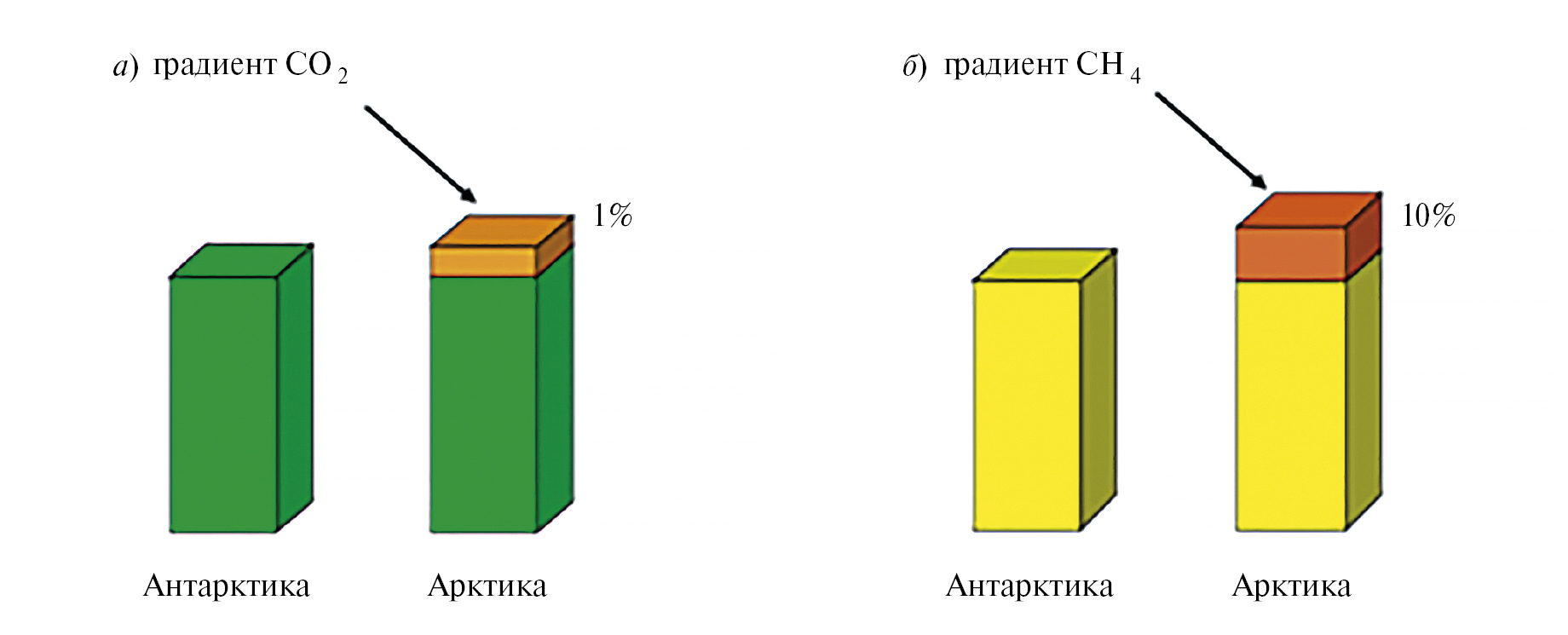 Рис. 3. Межполюсный градиент концентраций: а – атмосферного СО2, б – атмосферного СН4.