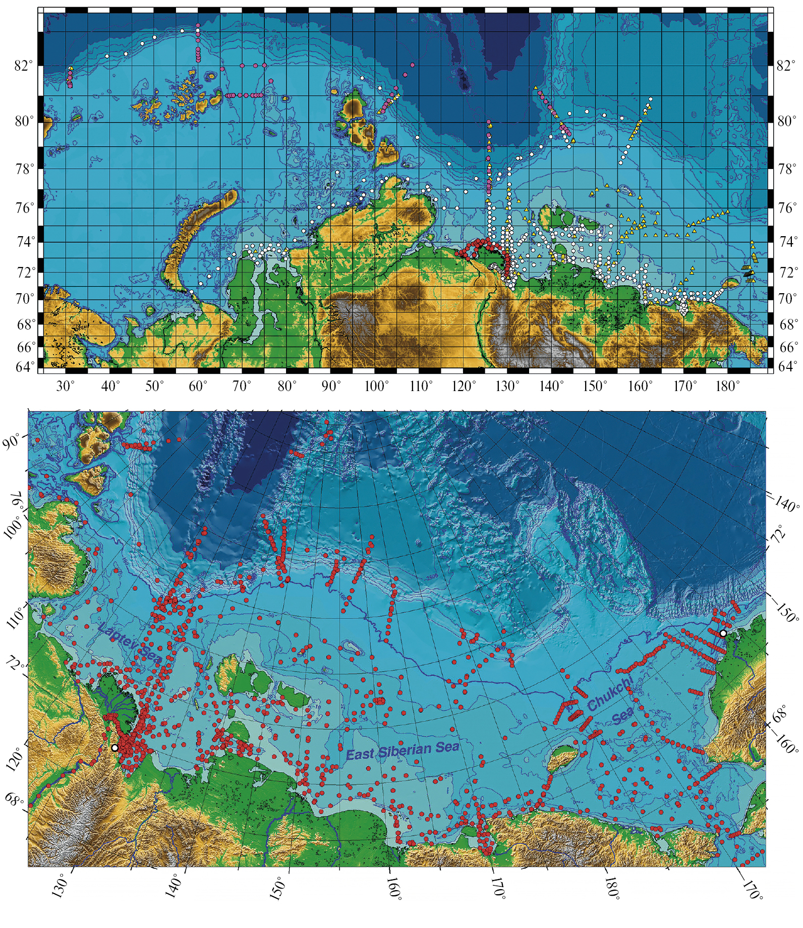 Рис. 4. Район исследований и положение океанографических станций в арктических морях России, выполненные в августе–сентябре 2003–2009 гг. (сверху), снизу – карта комплексных станций в МВА, где проводились исследования динамики компонентов углеродного цикла, включая СО2 и СН4, и их обмена с атмосферой (1996, 2010–2020 гг.).