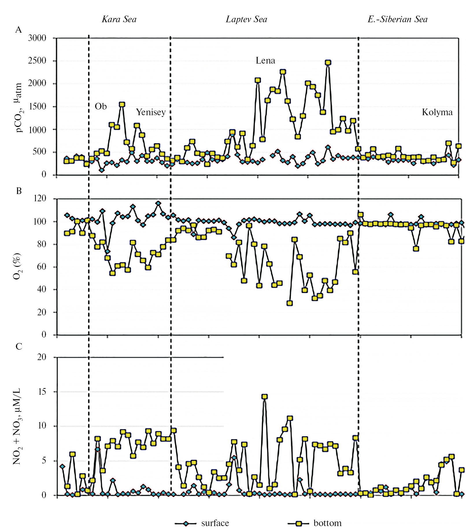 Рис. 6. Распределение величин рСО2 (А), степени насыщения растворенным O2 (В), суммы нитриты–нитраты (С) в морях Российской Арктики по Северному морскому пути (по маршруту движения в трансарктической экспедиции на борту ГС «Николай Коломейцев» в сентябре 2000 г.).