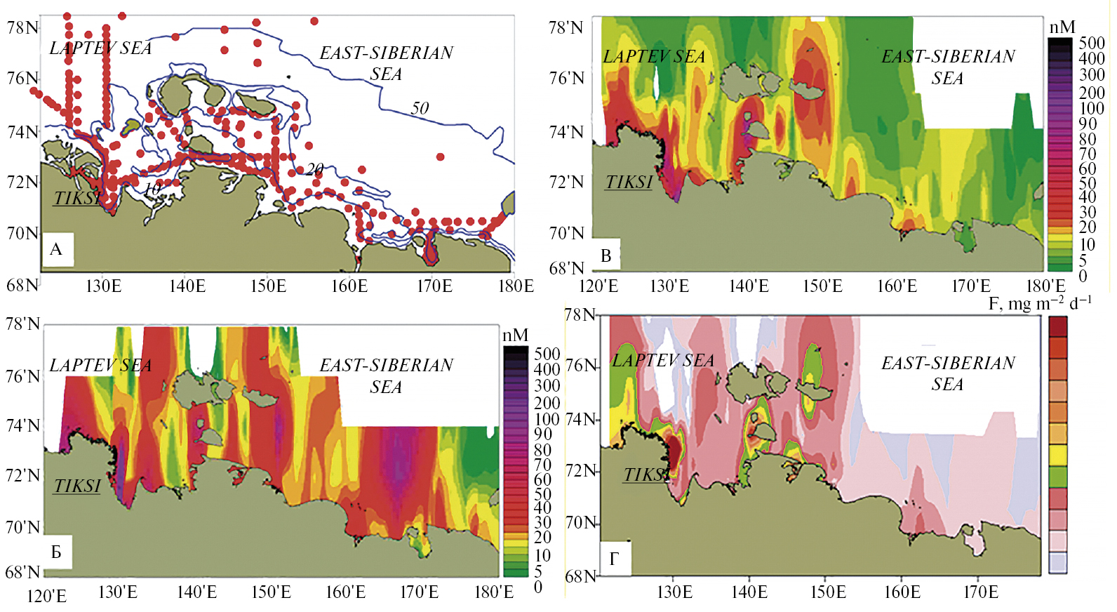 Рис. 7. Положение океанографических станций в районе исследования (А); распределение концентраций растворенного СН4 в придонном слое воды (Б); распределение концентраций растворенного СН4 в поверхностном слое воды (В); диффузионные потоки СН4 (Г).