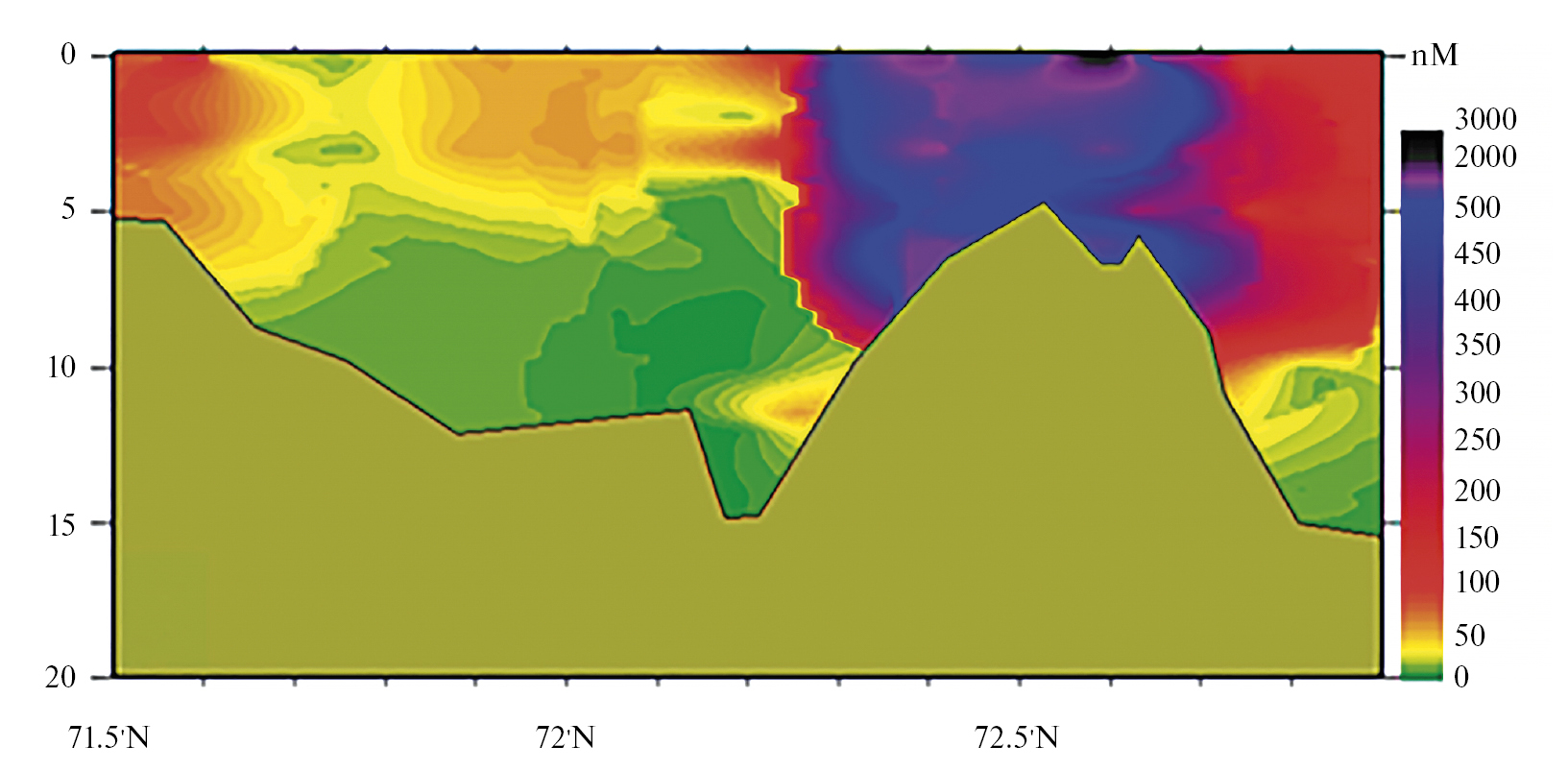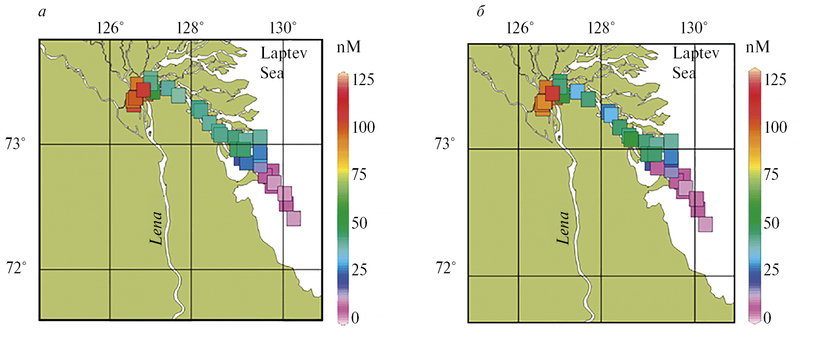 Молекулярный анализ органической фракции донных отложений показал, что на акватории Северного морского пути при движении с запада на восток возрастал (от 32 до 42%) вклад фурфуролов (furfurals), которые характеризуют свежесть (freshness) – малую степень декомпозиции ОВ [85]. В то же время по направлению с запада (приустьевая зона Оби и Енисея) на восток (устье Индигирки) относительный вклад нитрилов (nitriles) снижался, что в сочетании с увеличением относительного вклада фурфуролов (от 32 до 42%), свидетельствуют о том, что в Восточной Арктике древнее ОВ способно к дальнейшей деструкции в большей степени, чем в Западной Арктике (бассейн Карского моря). Другими геохимическими индикаторами, подтверждающими правильность нашей гипотезы о важной роли разрушения берегов арктических морей в биогеохимии арктических морей, являются: определяющий вклад наземного органического вещества (СТОМ – contribution of terrestrial organic matter) в формировании донных осадков (до 100% в прол. Дмитрия Лаптева) и «терригенное» C/N отношение в составе органического вещества в донных отложениях [16, 67, 84, 86]. Аномально высокие значения рСО2 и биогенных элементов в прибрежных водах вблизи быстро эродирующих береговых ледовых комплексов и в придонных водах в районах аккумуляции наземного органического вещества также свидетельствуют об определяющей роли эрозионного ОУ в биогидрохимии исследуемого района [76]. Так, на рис. 6 можно увидеть, что аномально высокие значения рСО2 могут достигать 2500, а на некоторых станциях 3000–4000 μатм от поверхности до дна [67], что намного выше известных аномалий, когда-либо обнаруженных в Мировом океане.