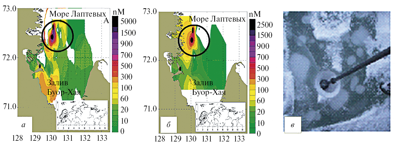 Рис. 10. Распределение концентраций растворенного метана в водном столбе в районе Буор-Хая, измеренное подо льдом в апреле 2007 г.: а – поверхностный слой воды; б – придонный слой воды; в – пузыри, включенные в состав льда (модифицировано из [20, 31]).