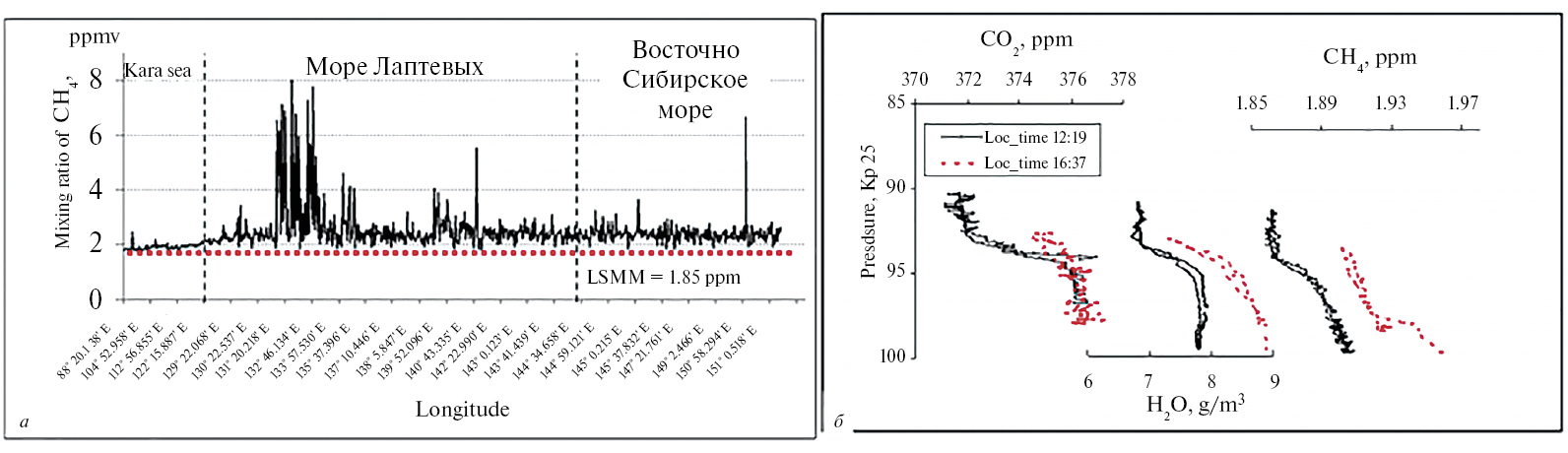 Средняя концентрация атмосферного метана в Карском море составляла 2,1±0,02 ppm, в море Лаптевых среднее значение возросло до 2,97±0,15 ppm, а в Восточно-Сибирском море составило 2,66 ± 0,09 ppm. Резкие всплески концентраций достигали в море Лаптевых 8,2 ppm, а в Восточно-Сибирском море – 6,4 ppm [20, 52]. Данные, полученные в результате вертолетной съемки, зарегистрировали увеличение атмосферных концентраций метана до высоты 1800 м; это увеличение достигало 5–10% от величины средней концентрации для данных широт (1,85 ppm). На основе летних измерений 2005 г. было показано, что области повышенных концентраций атмосферного метана коррелируют с областями плюмов растворенного метана [20] (рис. 12).