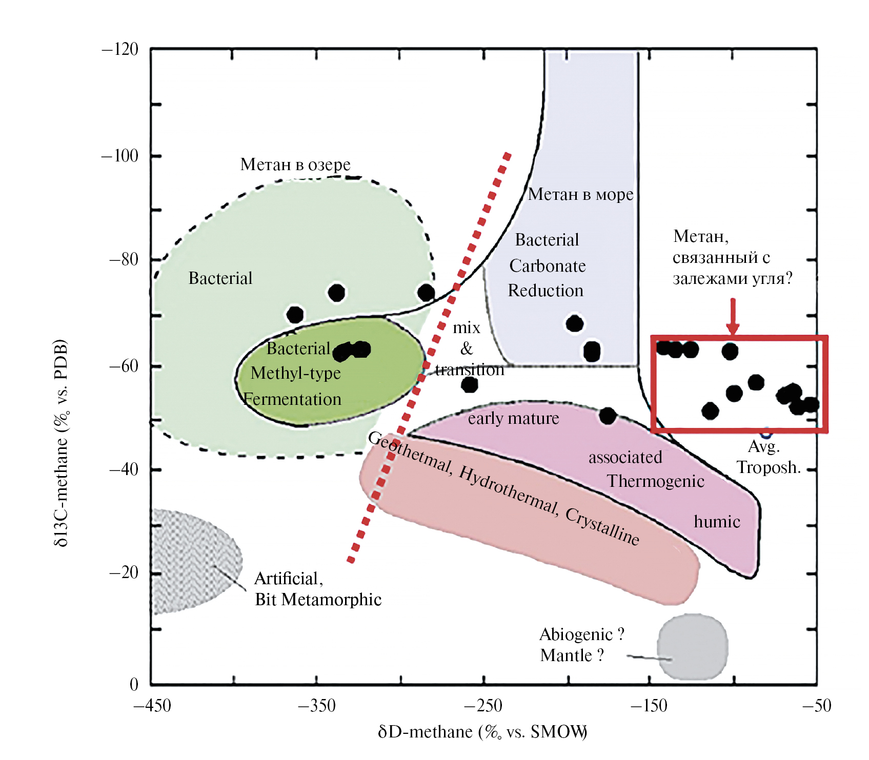 Особенности пространственного и вертикального распределения растворенного СН4, а также сезонная динамика не могут быть объяснены современной продукцией СН4 в донных осадках МВА, поскольку территориальное распределение растворенного метана в придонном слое воды в изучаемом районе отличалось высокой степенью мозаичности и не коррелировало с распределением концентраций органического углерода (Сорг) в донных осадках [56]. Например, в прол. Дмитрия Лаптева, где концентрация Сорг минимальна и составляет обычно <0,5%, на протяжении многих лет была зарегистрирована устойчивая аномалия растворенного метана (до 154 nM), равномерно распределенного в водном столбе. Отметим, что в работе Арэ [94] описаны многочисленные случаи, когда в ходе выполнения работ на российском арктическом шельфе неоднократно наблюдались прорывы газовых струй из дна в воду–воздух. Описан случай, когда при поведении взрывных работ для навигационных целей в прол. Дмитрия Лаптева воздух надо льдом загорелся синим пламенем [95], что может свидетельствовать о выбросе природного метана (возможно, гидратов) из донных залежей. Результаты многолетнего мониторинга районов массированных выбросов пузырькового СН4 и кернов донных осадков свидетельствуют о том, что в МВА струи СН4 поступают из глубинных источников через газопроводяшие каналы, минуя слой сульфатредукции [54–56], который является биогеохимическим фильтром, препятствующим поступлению биогенного СН4, образованного в процессе диагенетических преобразований в осадках Мирового океана [96].