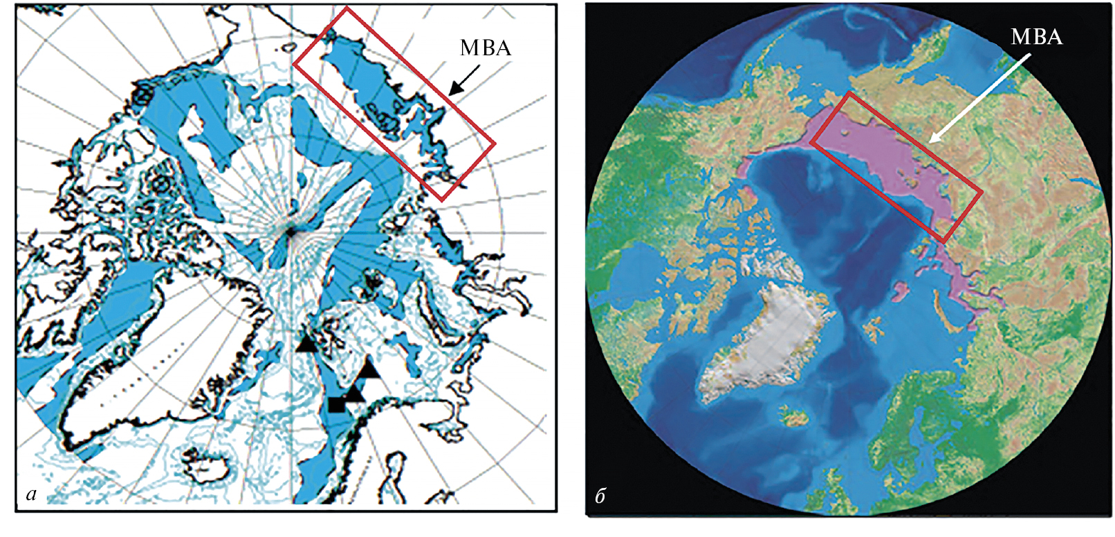 В связи с этим особую актуальность приобретает вопрос о механизме формирования планетарного максимума СН4 и СО2 в атмосфере, что может свидетельствовать о важной роли Северного Ледовитого океана (далее – СЛО), окруженного наземной и подводной мерзлотой, в современных климатических изменениях, которые в наиболее явном виде проявляются в Арктике. В последние десятилетия наибольшее потепление зарегистрировано над Аляской и в российском секторе Восточной Арктики (МВА), где находится примерно 80% подводной мерзлоты СЛО (рис. 1), деградация которой приводит к дестабилизации гигантского пула гидратов и массированным выбросам СН4 [17].